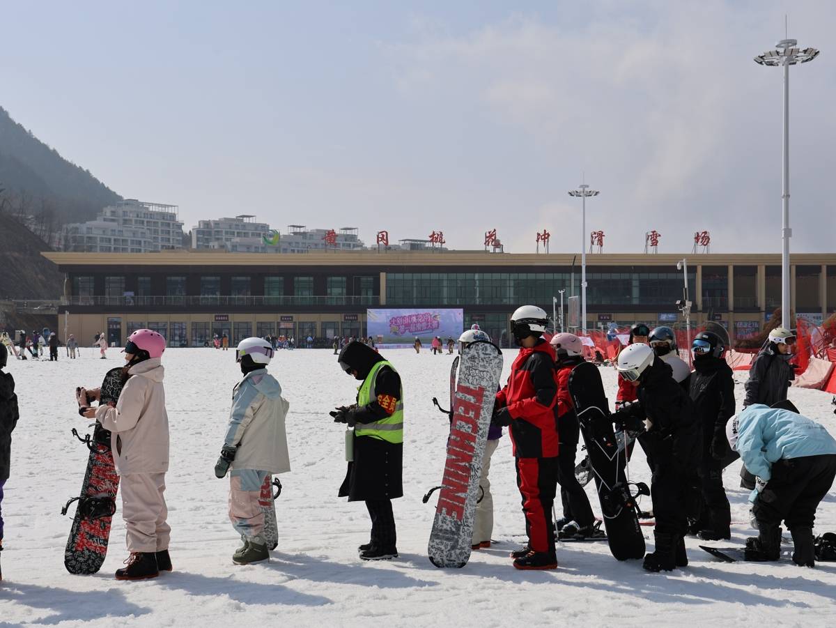 排队等候坐缆车上高级道的雪友。(湖北日报全媒记者刘毅摄)