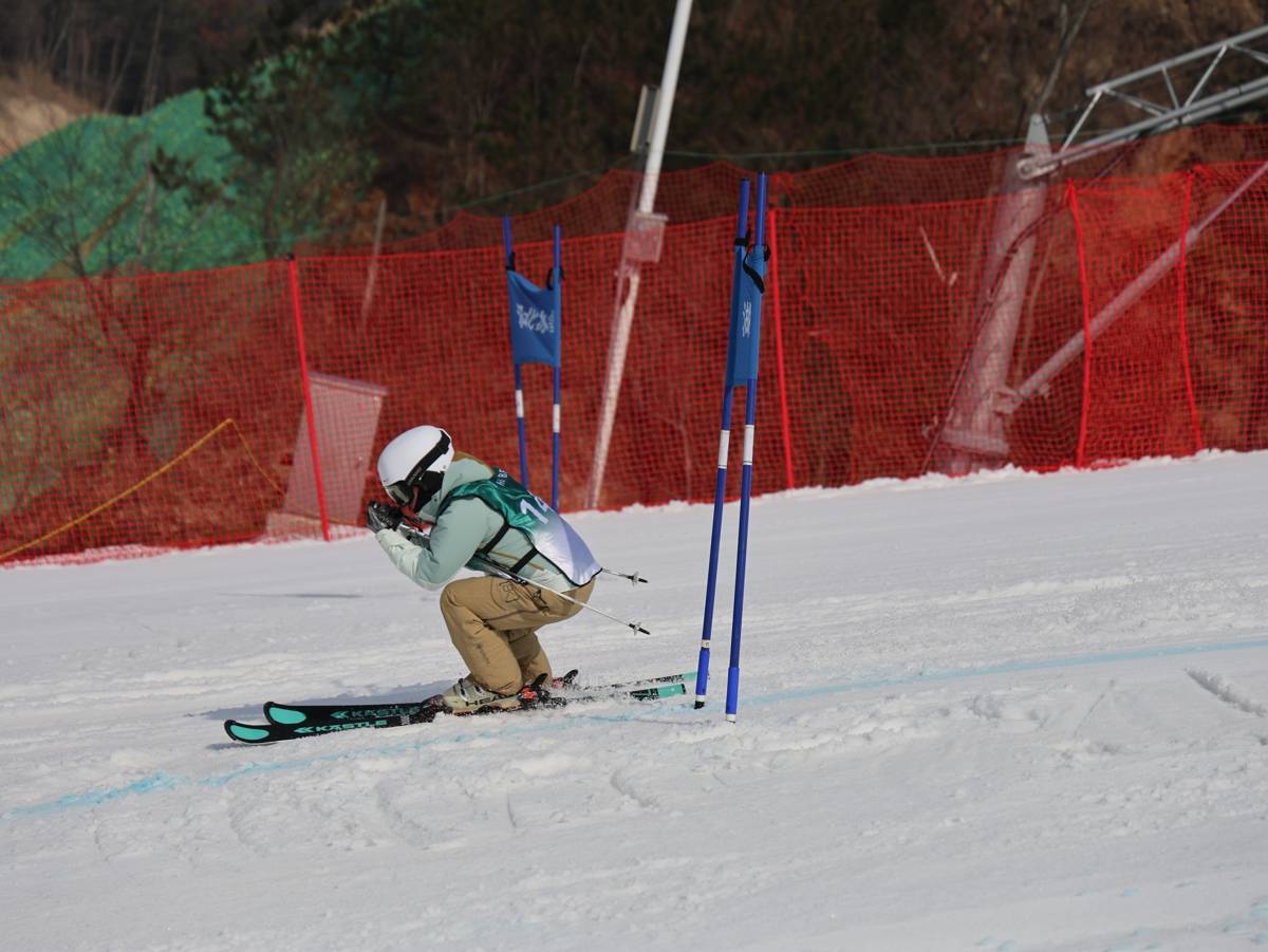 200米长的洁白雪道上,红蓝两色的旗门标定出比赛路线。选手们身穿鲜艳的滑雪服,脚踏雪板,在高速下滑中,灵活地绕过一个又一个旗门,身上的飘带随风起舞,尽显青春活力。