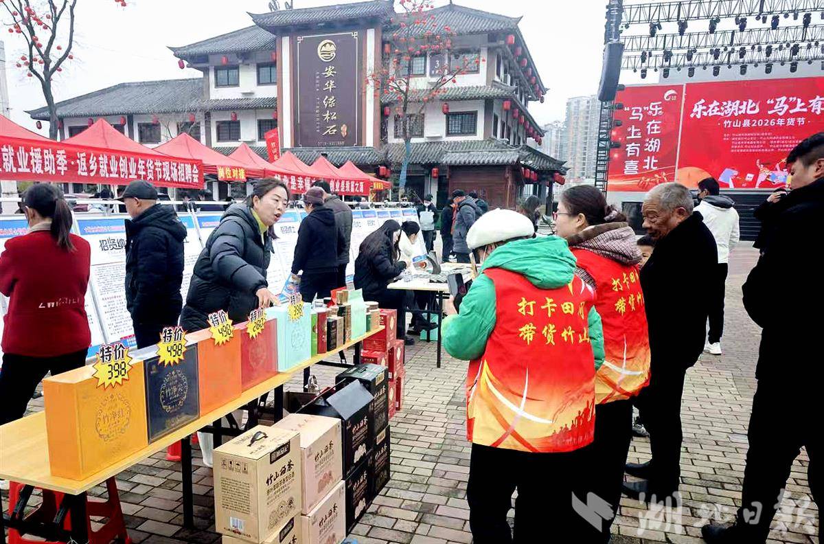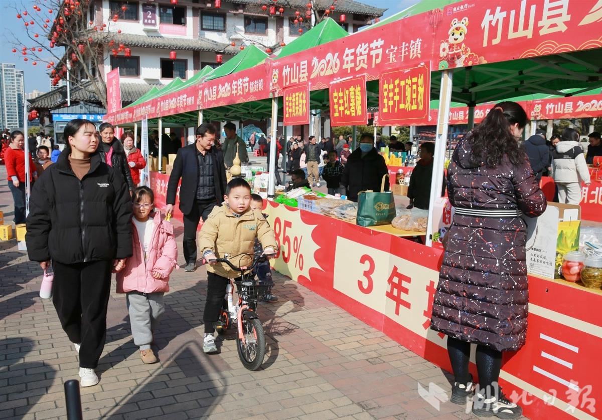 今年1月,湖北省商务厅启动“乐在湖北,‘马’上有喜”新春促消费活动。作为县域联动分会场,竹山县2026年货节在桃花源街区及女娲广场举行,40余家龙头企业和个体商户搭建起琳琅满目的年货风景线——既有竹山茶叶、菌菇、粮油、腊肉、蜂蜜、豆腐乳等特色农产品,也有服装鞋帽、家居日用、儿童玩具、节庆装饰等传统年货,还有智能家电、潮玩饮品等新年货,每日现场客流量超千人,叫卖声、欢笑声汇成一片。