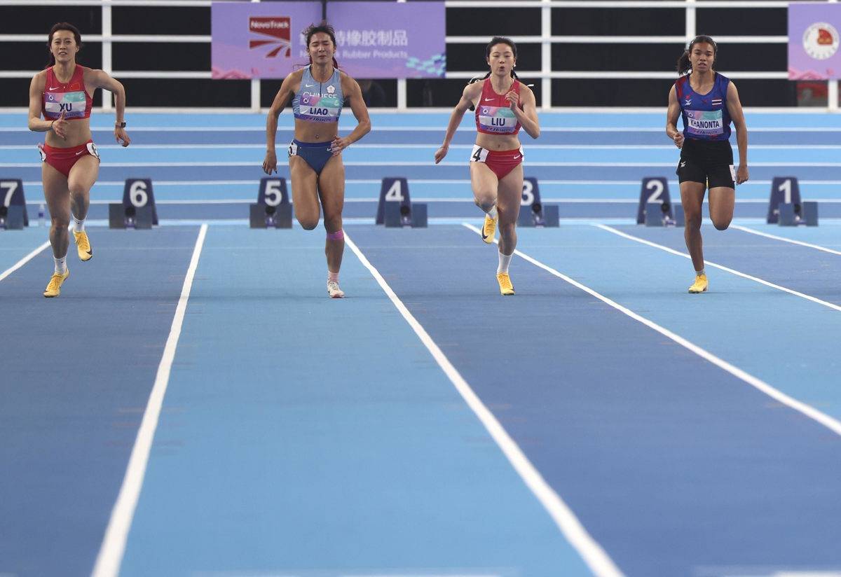 2月7日,冠军中国选手许佳璐(左一)、季军刘峡君(左三)在天津室内田径亚锦赛女子60米决赛中。