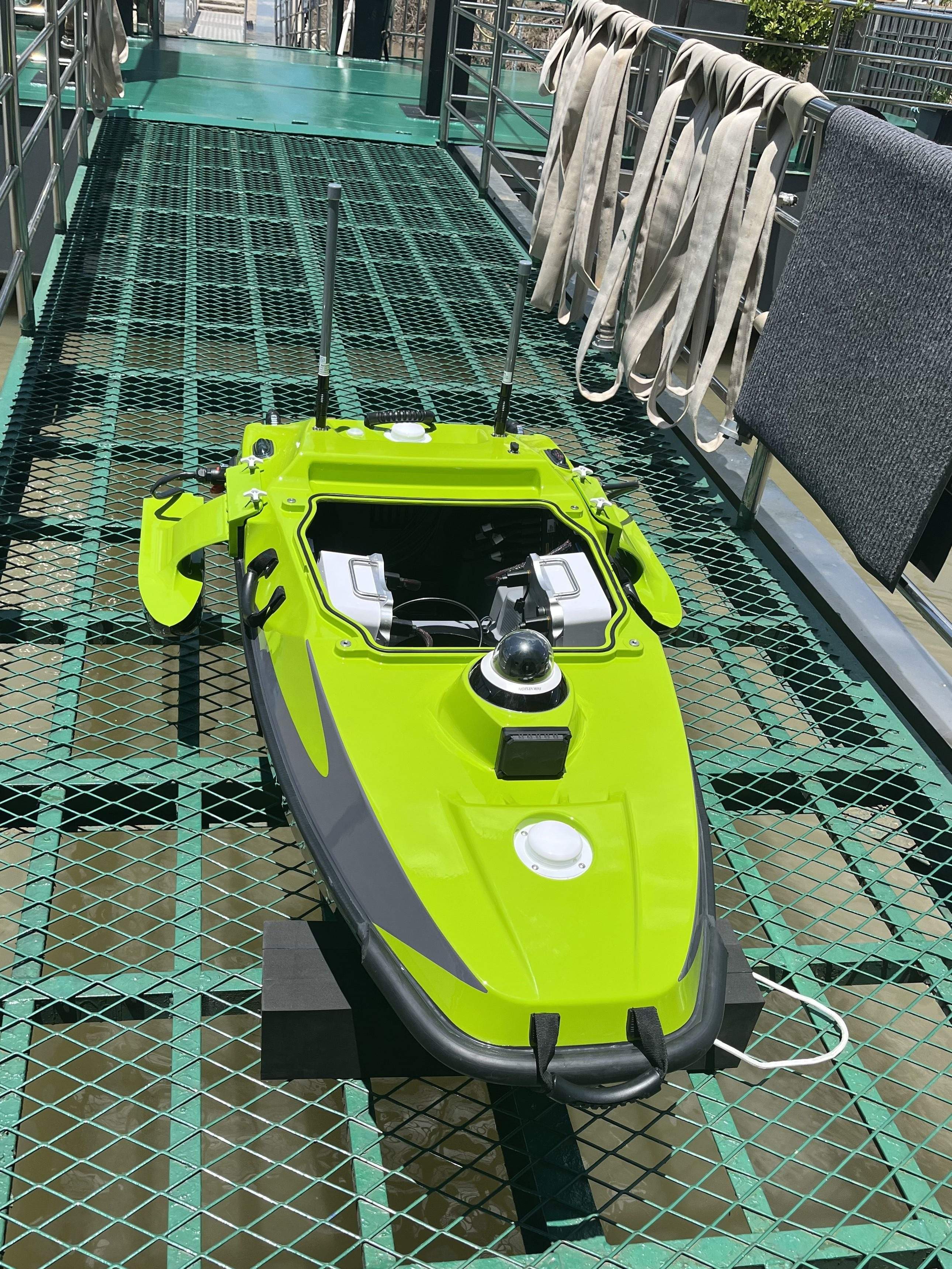 无人测量船长啥样?记者看到一艘草绿色无人测量船被吊入江中,它长约2米,船体两侧安装传感器支架,根据需要搭载测深仪等设备。