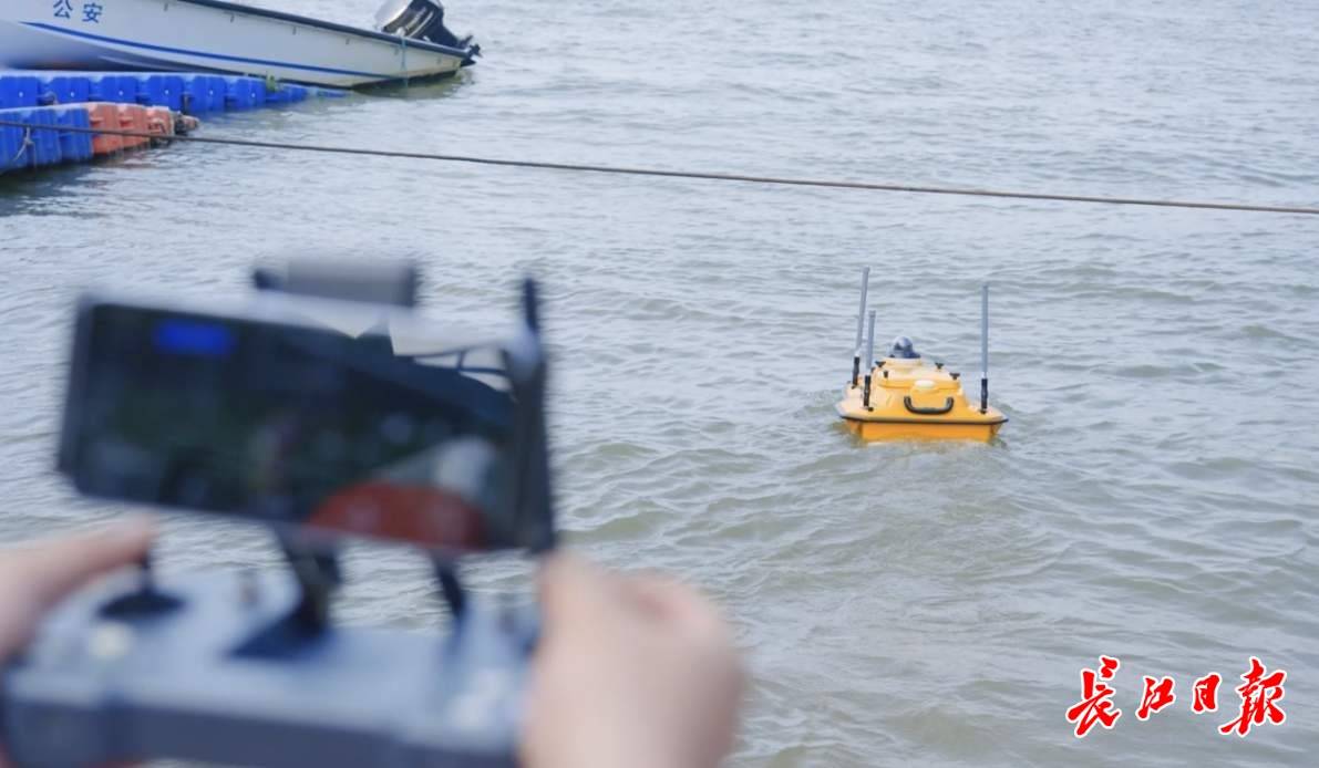 工作人员在操作无人测量船。 长江武汉航道局提供