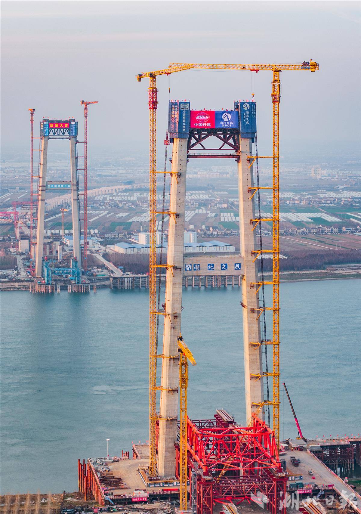 航拍荆州李埠公铁长江大桥南北主塔。(湖北日报全媒记者 柯皓 摄)