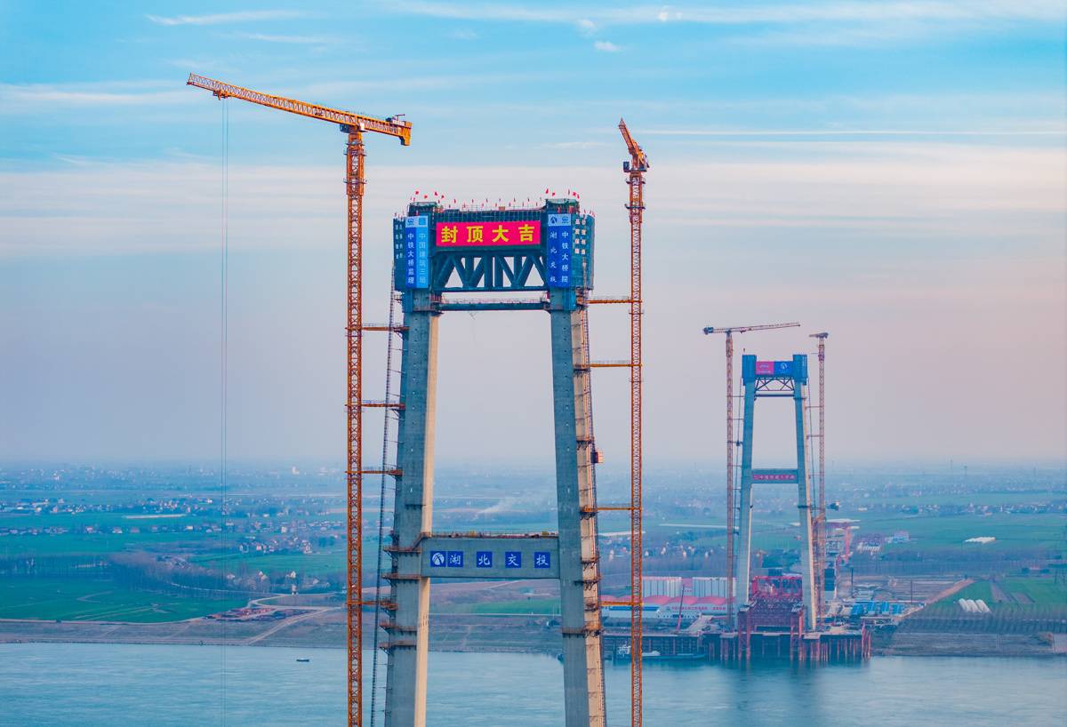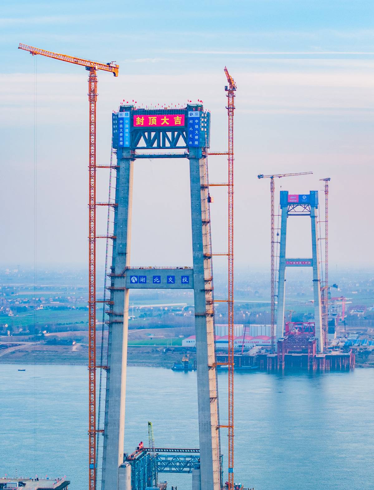 2月9日,由湖北交投集团投资,中建三局、中铁建大桥局承建的荆州李埠长江公铁大桥,其南北两座高分别高220.5、215.5米的主塔同日成功封顶,标志着这项世界级工程正式转入上部结构施工新阶段,建设全面提速。(湖北日报全媒记者 柯皓 通讯员 吴迪 摄)