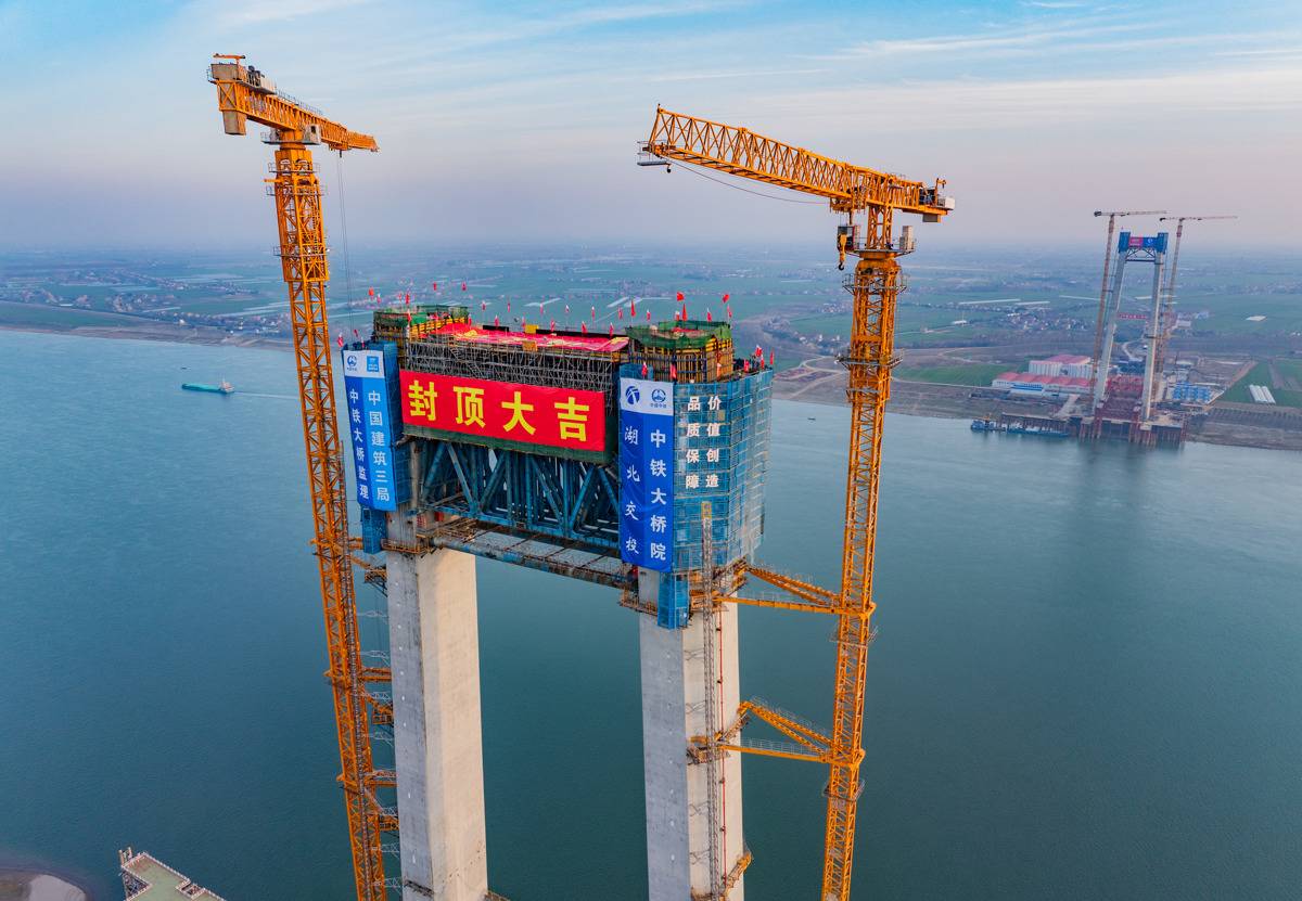 荆州李埠长江公铁大桥主塔封顶。(湖北日报全媒记者 柯皓 通讯员 吴迪 摄)