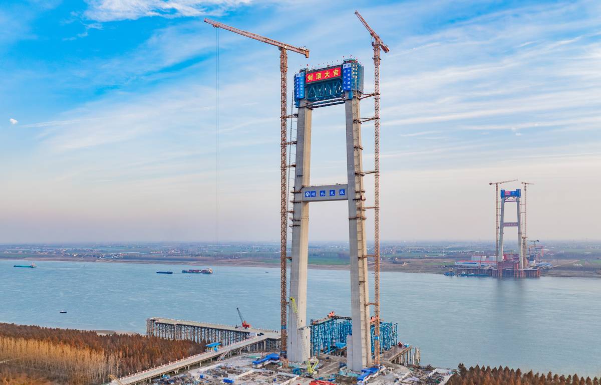 荆州李埠公铁长江大桥两岸主塔封顶。(湖北日报全媒记者 柯皓 摄)