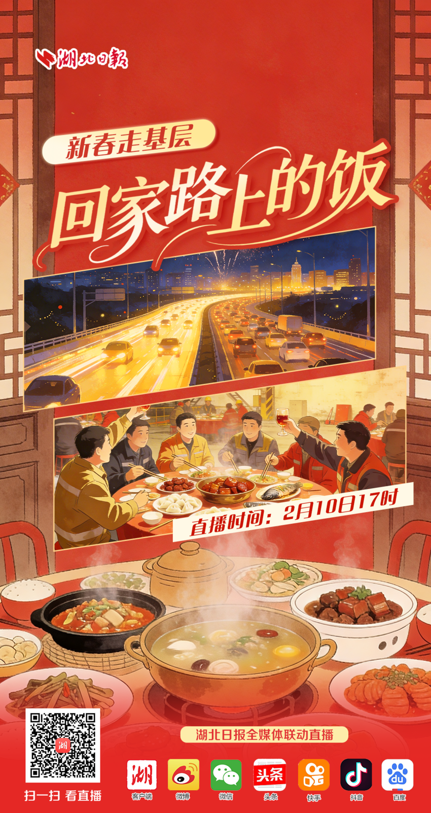 10日17时,锁定湖北日报直播间,我们线上相伴,温暖“开席”,向每一位“在路上”的奋斗者致以新春的问候!