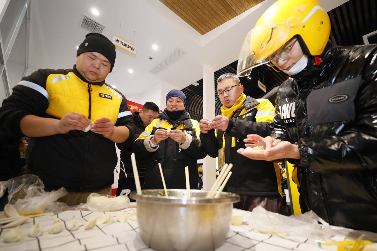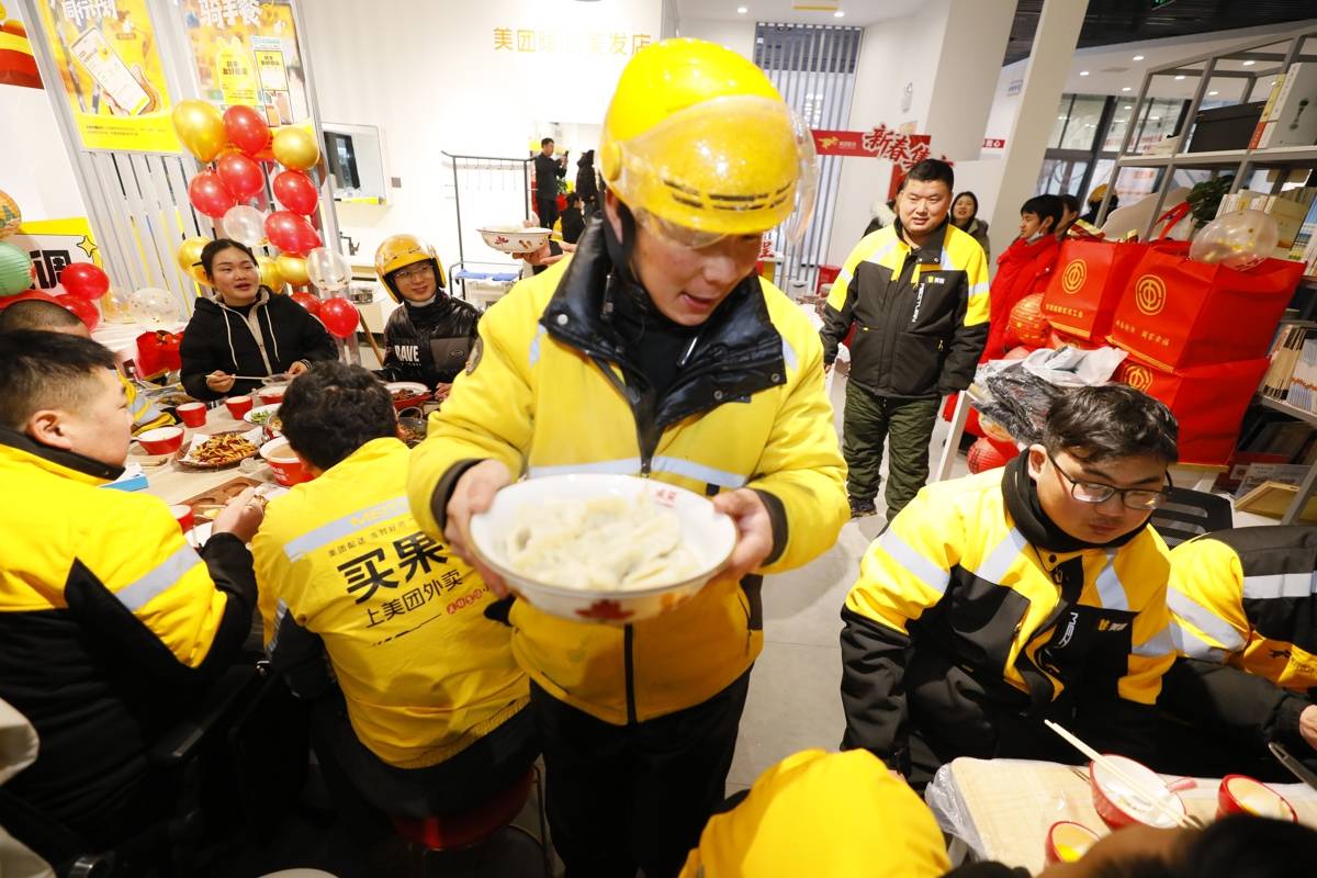 2月9日(腊月二十二)下午,武汉光谷工会驿站(骑手之家)外卖骑手们欢聚一堂,大家一起包饺子、吃团年饭。他们分工协作,揉面、擀皮、调馅、包捏,动作从生疏到熟练,一直欢声笑语不断。一双双平日里紧握车把、疾驰城市脉络的手,共同制作着象征团圆与吉祥的饺子,温情在指尖传递。骑手们边包饺子,边说了很多心里话。