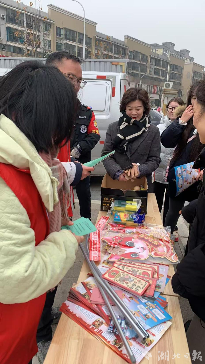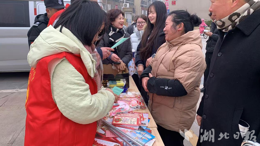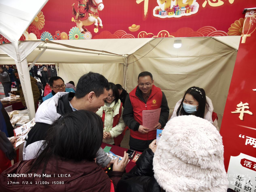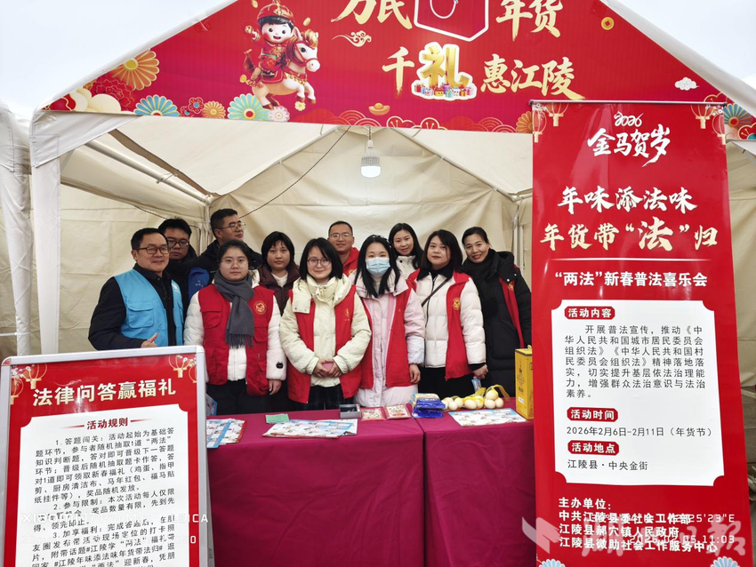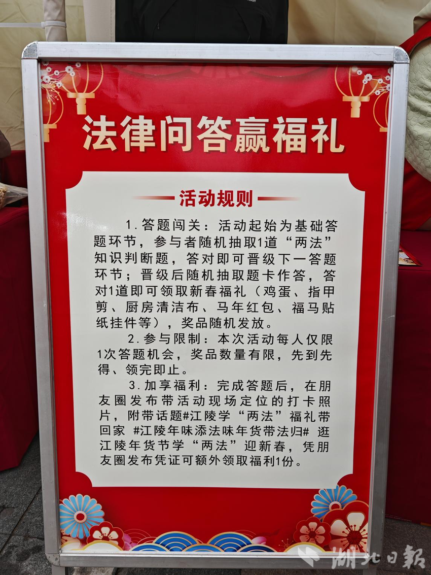 年货市集内,将普法与新春年货节有机结合,设置专属普法互动区,以“答题闯关赢福礼”为核心,工作人员用通俗语言出题,题目均源自“两法”,聚焦村(居)“两委”职责、居民选举权等群众切身相关知识点。参与群众答题正确可领实用奖品,答错后志愿者当场讲解重难点,确保学懂弄通;同时现场发放“两法”宣传折页,让群众在逛市集、领奖品中潜移默化学习法律知识。