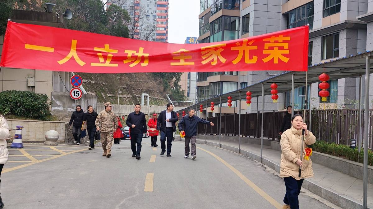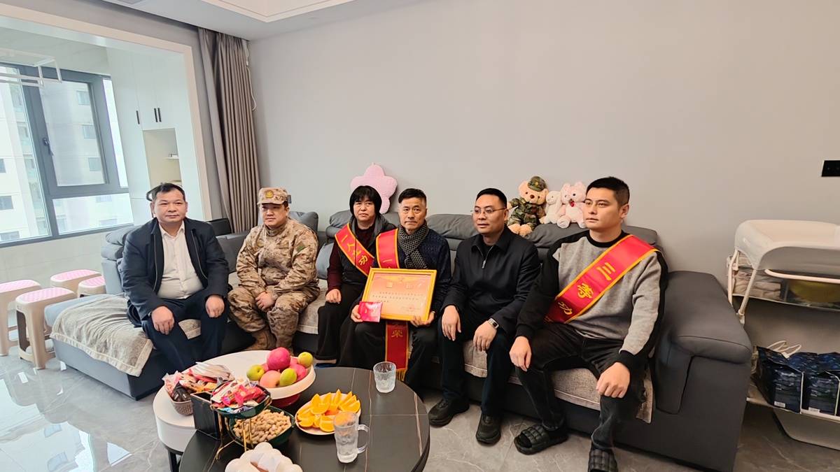 邻居们闻锣鼓声而来,聚在军属家门前,道喜声、欢笑声交织在一起,一片喜庆。军属们郑重地接过喜报,脸上满是欣慰与自豪。慰问组为军属佩戴“光荣之家”绶带,关切询问家庭近况,感谢他们为国防事业所做的默默贡献,希望他们一如既往当好立功军人的坚强后盾,继续为家乡增光添彩。