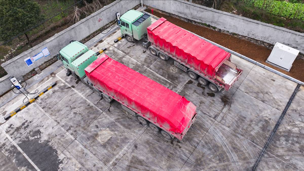 在中石化宜都梅子园超充站,正在充电的重型半挂车。湖北日报全媒记者 夏晓君 摄
