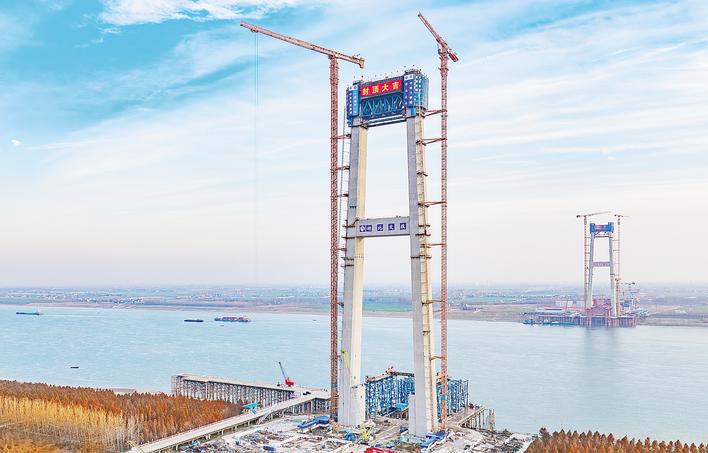 凛冽寒风中,站在荆州市荆州区江边,只见南北两座门式主塔巍然屹立于江边,分别高达220.5米、215.5米,作为未来大桥的“脊梁”,它们将承载起全长1723米、主跨达1120米的桥面。届时,汽车、高铁与城市车流将在约50米高空并行穿梭,蔚为壮观。