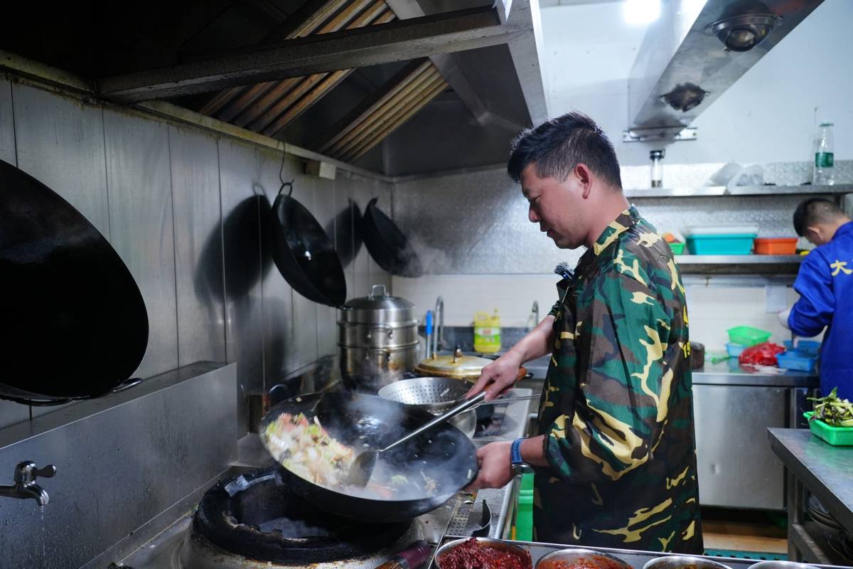 午后,竹根滩镇老街的丰顺餐馆后厨正忙。老板兼主厨张丰将大白菜、黑木耳、肉丸子、五花肉、黄花菜等食材一一码齐,朴实而丰盛。“贺菜要做得好,食材须鲜,火候要对。”他边说边做——焯水锁鲜,猪油煸肉,姜蒜爆香,再下蔬菜翻炒,一勺白醋激出香气,最后勾薄芡收汁。腾腾热气从厨房漫出,引得食客频频探头。