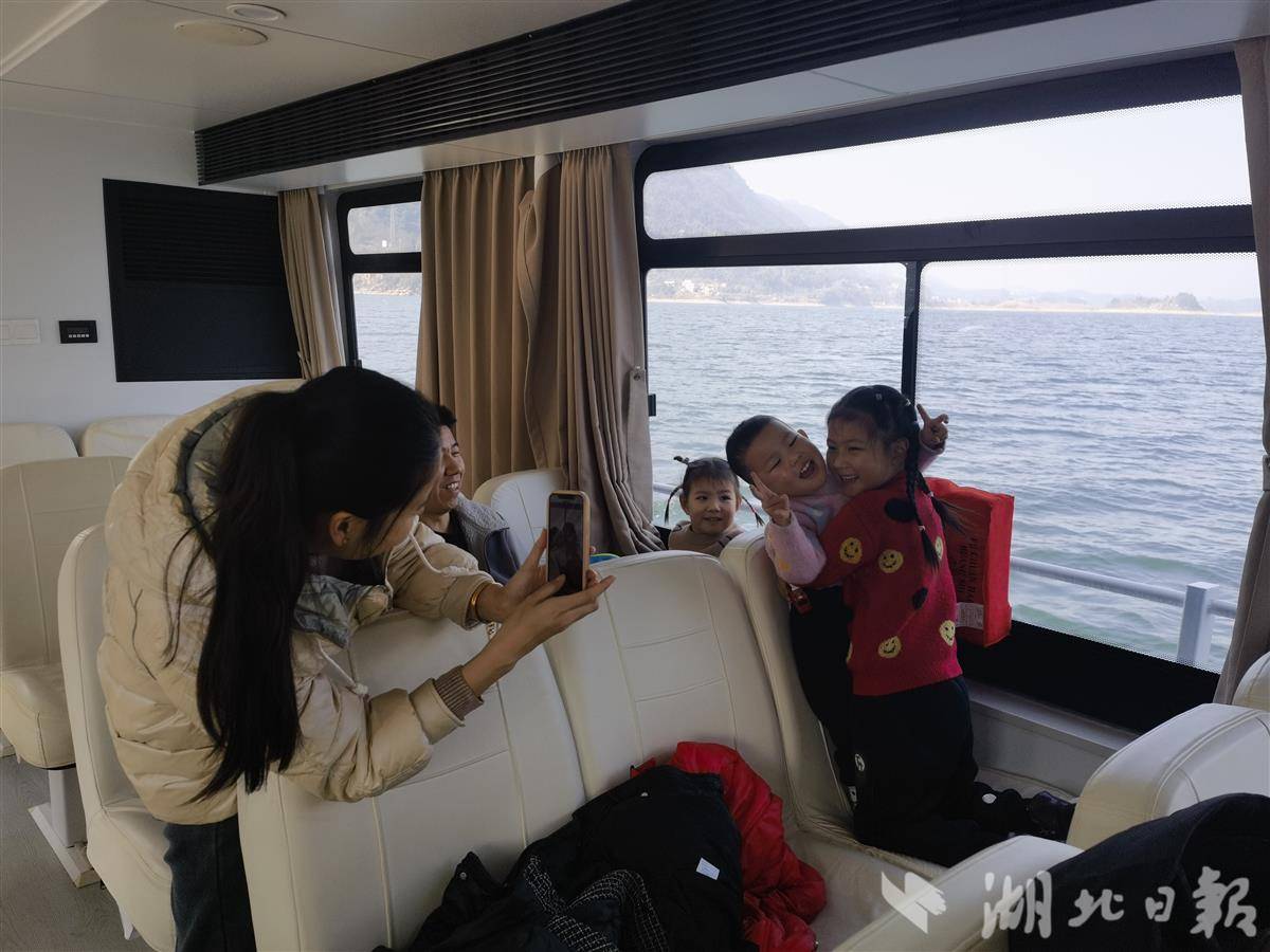 船舶不仅提速快,而且全程没有噪音,舱内十分安静。湖北日报全媒记者与10多名乘客一起走进船舱,里面有48个沙发座位,空调吹来阵阵暖风,船舱设置了透明玻璃窗,方便乘客观看仙岛湖美景。
