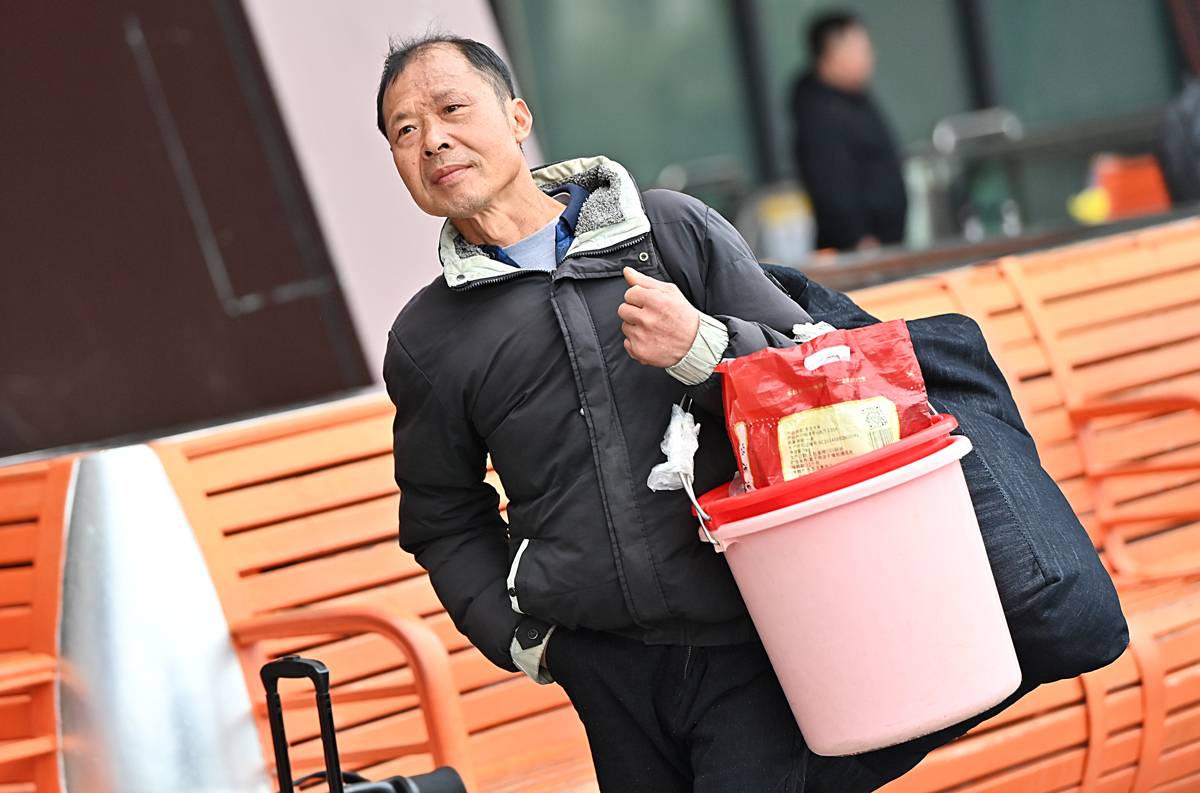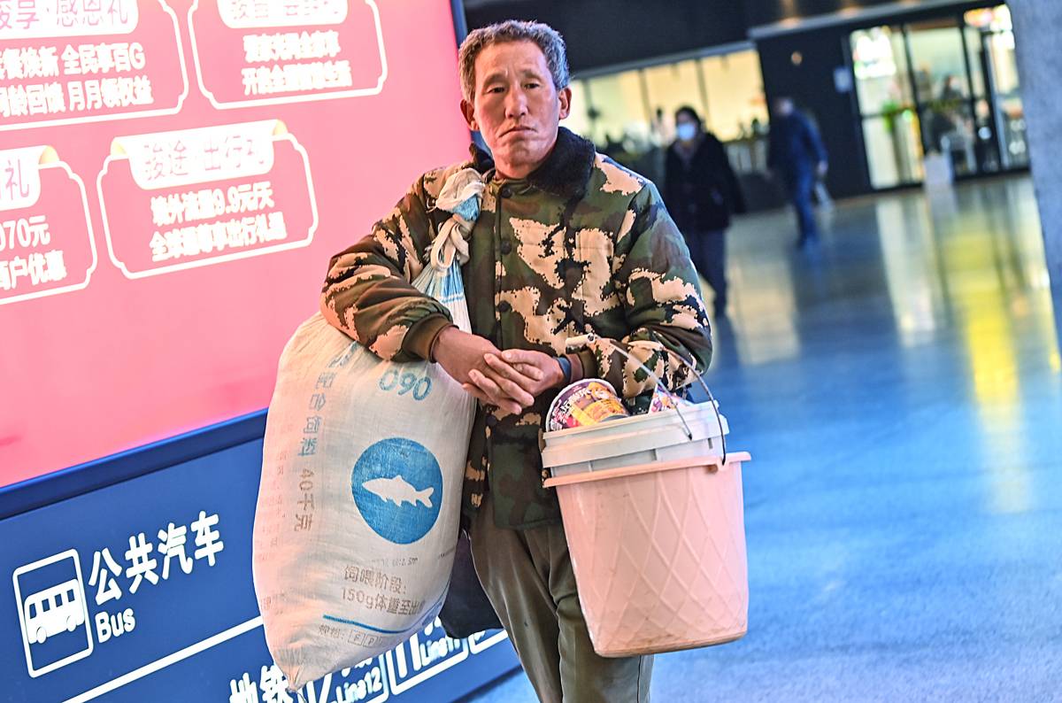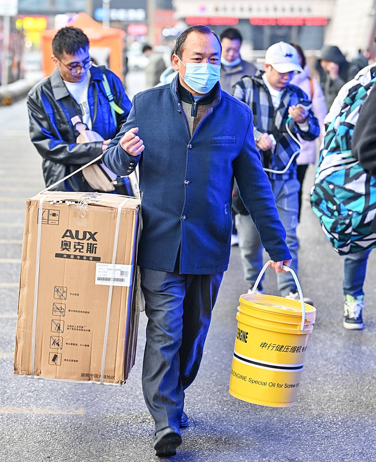 2月9日,武昌火车站,旅客带着大包小包行李返乡,有的或扛或挑沉甸甸的蛇皮袋,手提塑料桶,有的肩背用床单打包的行囊,看似简陋的装备,装满的是深厚的生存智慧与情感温度。