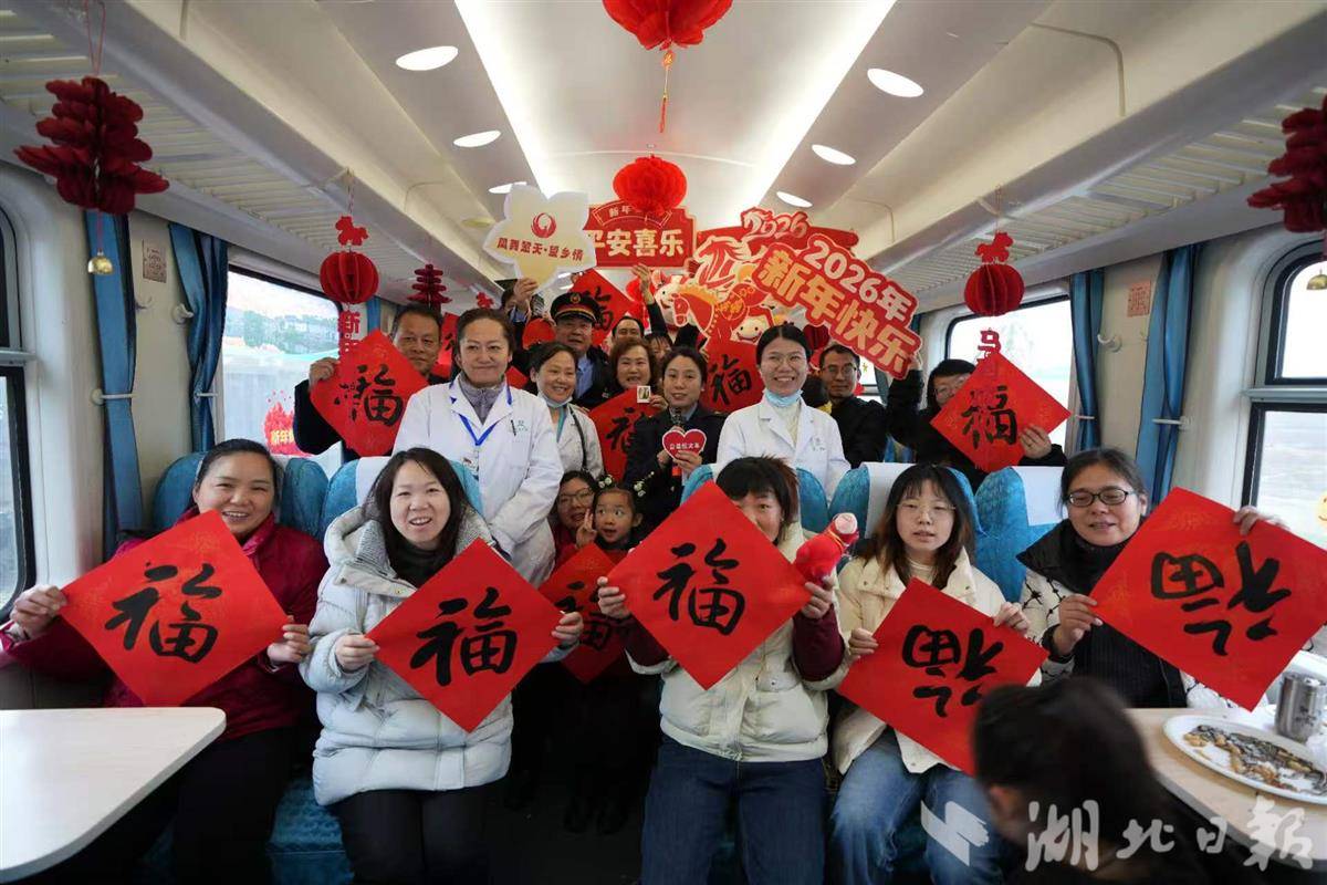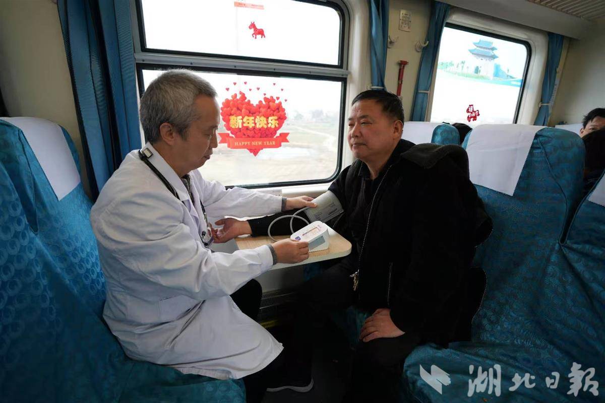 文艺表演余韵未消,车厢一角已变身为“流动健康驿站”。来自武汉科技大学附属天佑医院的专家志愿者团队,为旅客提供免费义诊、血压血糖测量和用药指导。一份份寓意健康的马年小礼物也随之送到大家手中。