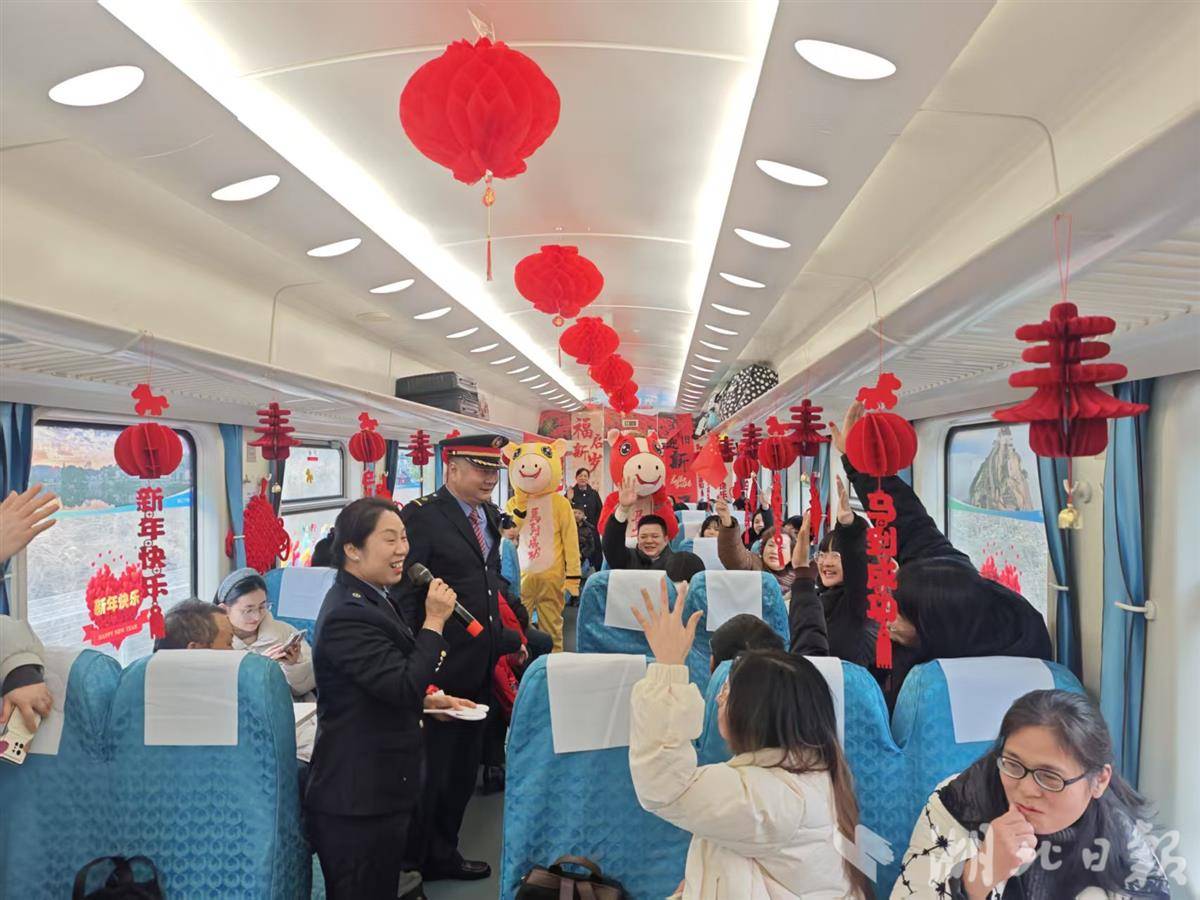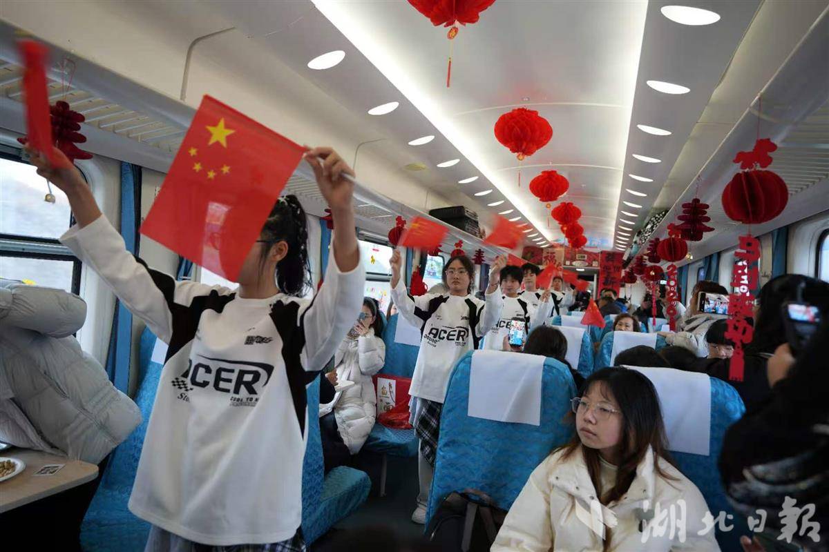 今年春运,这趟“慢火车”装进了不一样的“快”服务与“暖”年味。2月9日上午9时许,列车从麻城站驶出不久,欢快的音乐便响彻车厢。专业舞者带来的《少年强则中国强》瞬间点燃气氛,《映山红》的悠扬歌声引发现场合唱,车厢里许多熟悉这段旋律的旅客轻轻跟唱。
