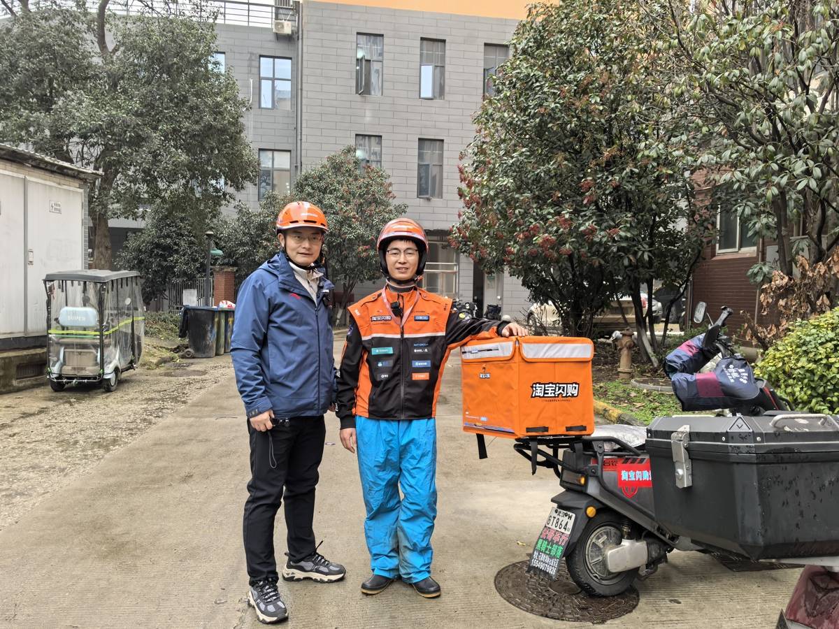 湖北日报全媒记者与外卖小哥(右)一起送餐。