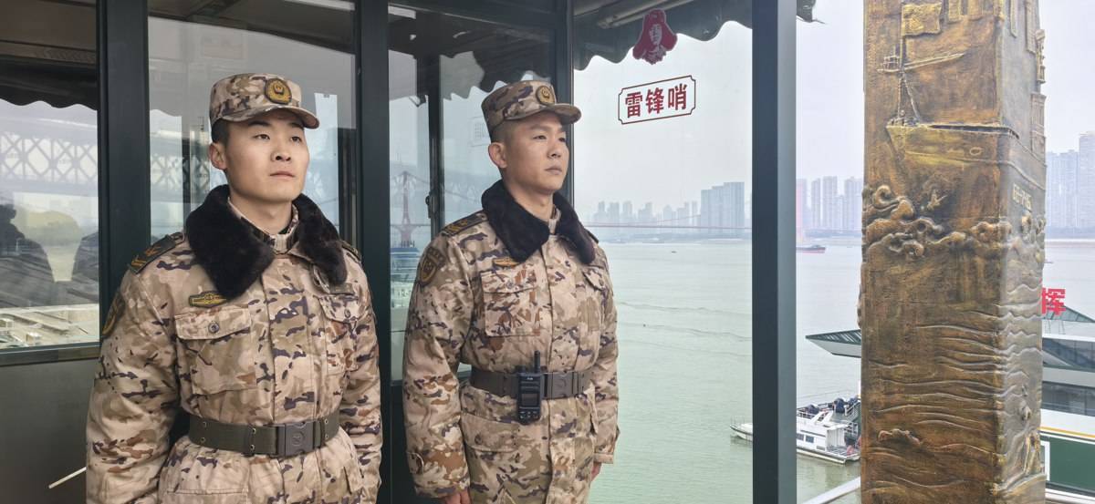 孟鑫(右)和战友站岗。