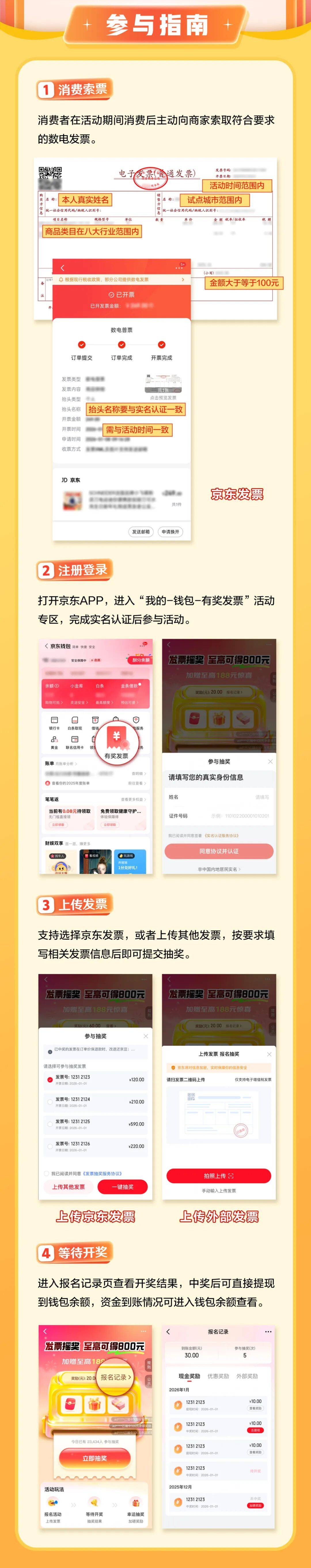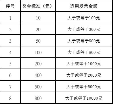 消费者上传发票后,系统即时反馈是否中奖。奖金分为多个档次,单张发票根据金额进入相应档次抽奖,如未中奖可自动参与下一档次抽奖,直至中奖为止。100元及以下奖金即时到账;100元以上奖金于中奖后7个工作日内兑付。