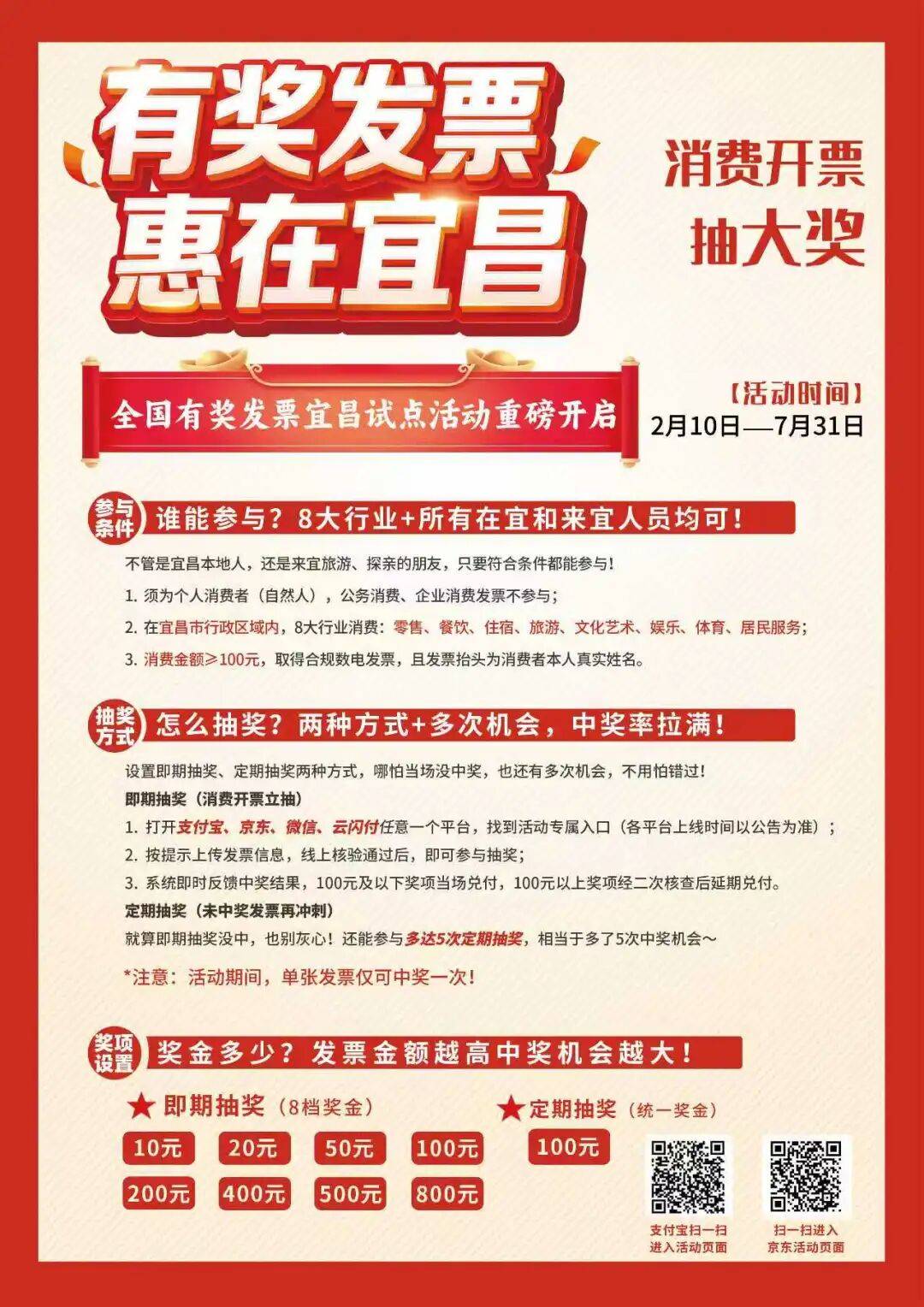 消费者在宜昌消费时取得的单张金额在100元及以上的数字化电子发票(限八大行业),发票上购买方信息填写的是消费者个人姓名,发票的开票日期需要在活动期间,都能参加“有奖发票”活动。