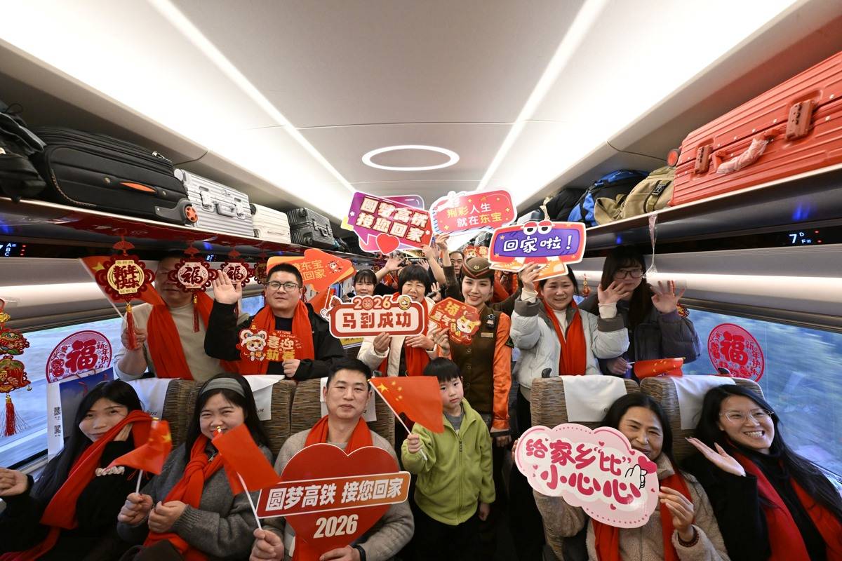 “常回家看看,回家看看……”熟悉的旋律响起,旅客们不约而同跟着合唱,掌声、笑声、乡音汇成一片。年味接龙、政策快问快答、乘务员礼仪秀……一个个互动节目让原本陌生的面孔迅速熟络起来。
