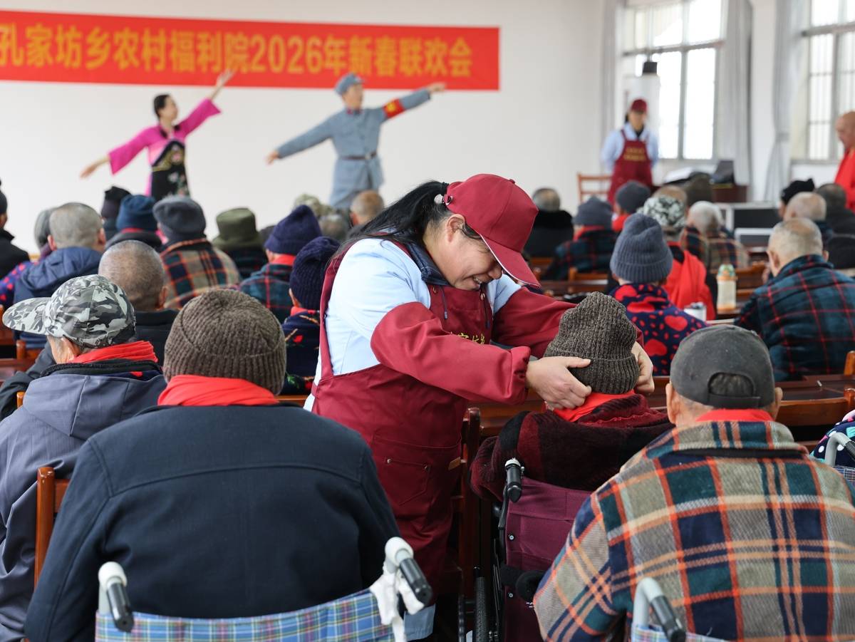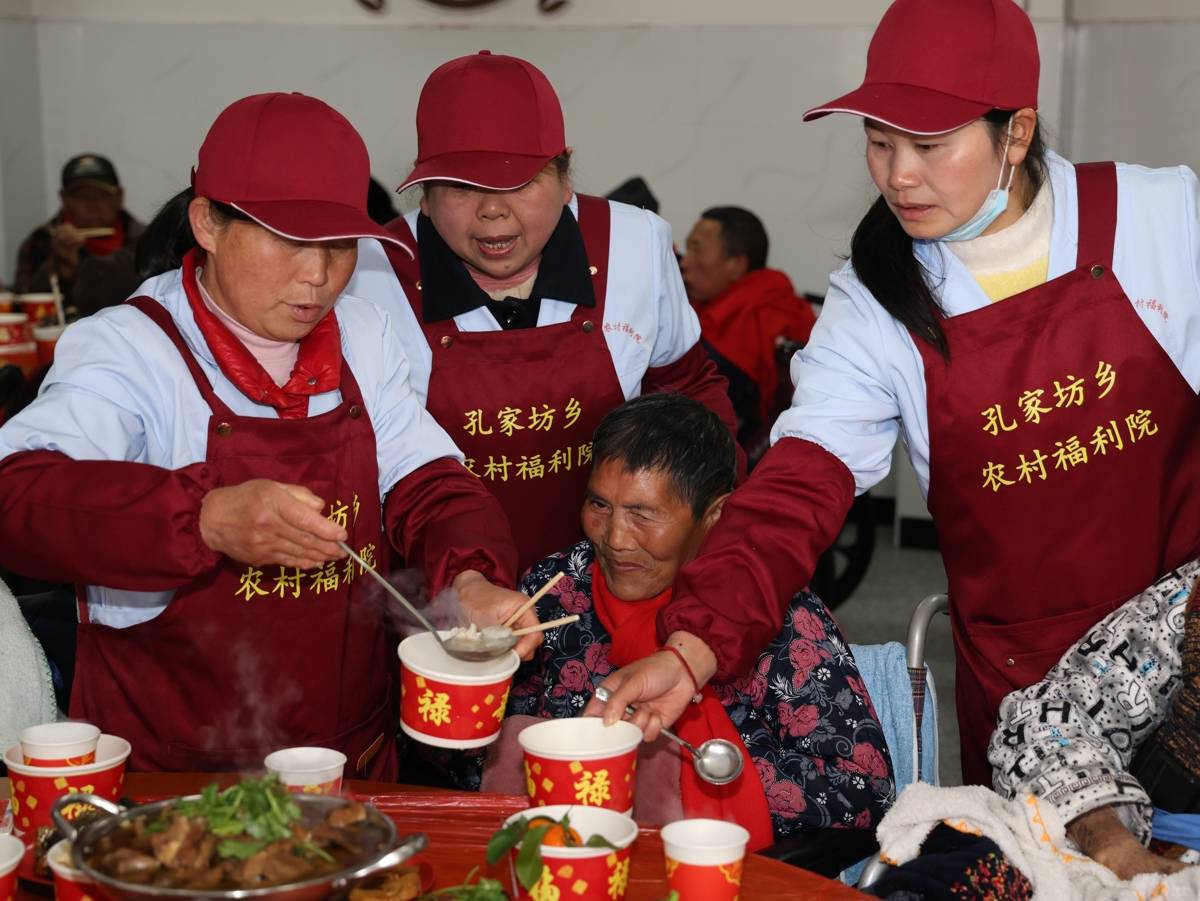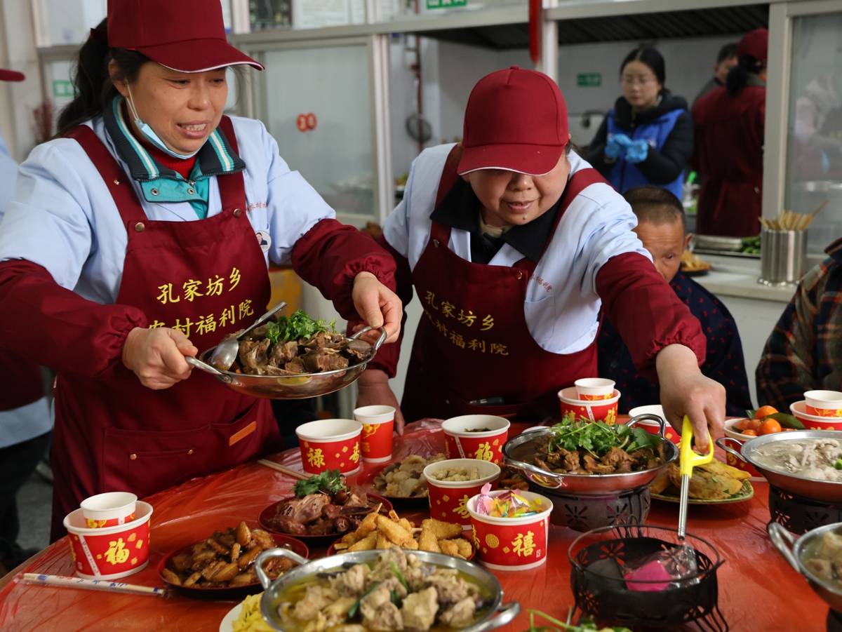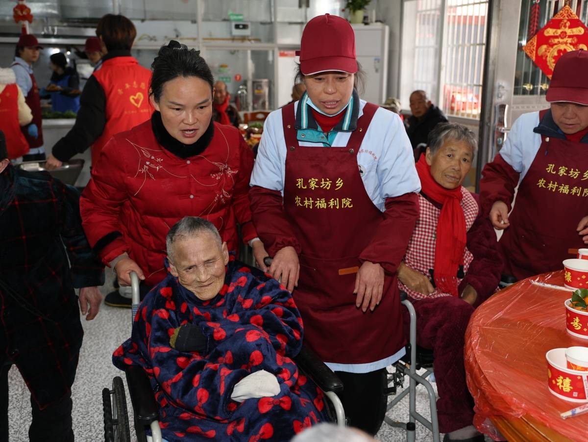 护工们帮助老人吃年饭。(湖北日报全媒记者 刘毅 摄)