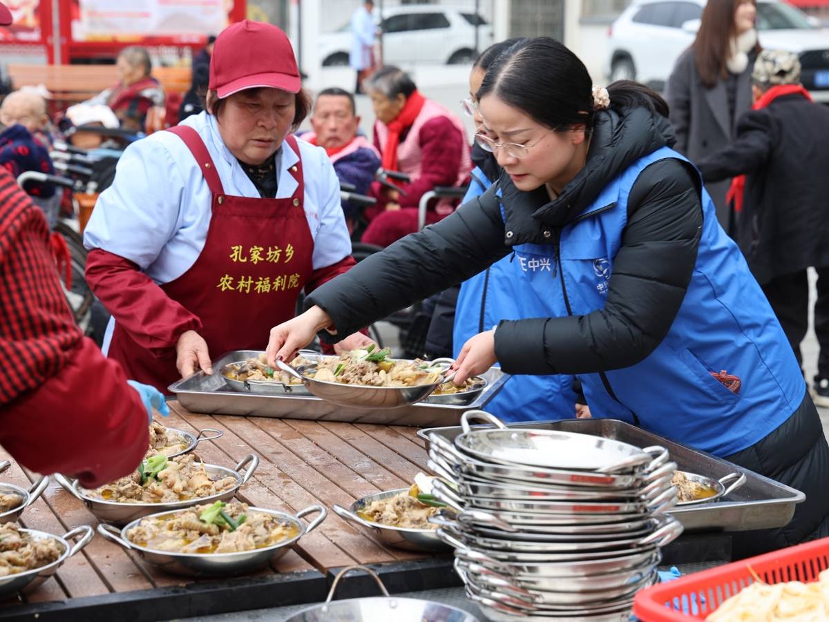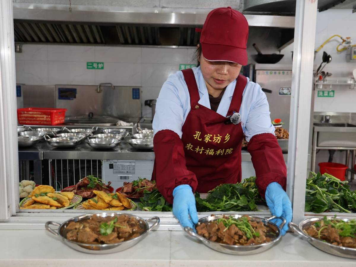 菜园里摘来的青菜洗得水灵灵的,和蛋丝、蛋饺、猪血丸子、鸡爪子等摆满了案台。“每桌有20多道菜呢,全都是我们自己做的。怕老人吃不动,肉都先用高压锅压一遍,特别费工夫。”王巧英说,包括上大学的女儿陈玉洁在内,还有好多志愿者前来帮忙。