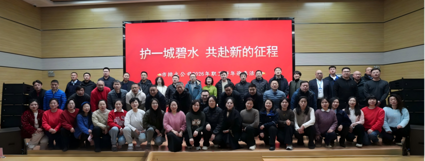 活动伊始,公司全体干部职工齐聚一堂,共同回顾了极不平凡的2025年。在武汉城投集团“165”发展战略与控股公司的坚强领导下,公司交出了一份亮眼的高质量发展答卷:全年安全高效处理污水达10.4亿吨,有力守护了城市水生态安全;运维管网由734公里提升至2109公里,成功培育新的利润增长极。与此同时,绿色发展硕果累累,北湖、黄家湖厂光伏电站年供应绿色电力超2900万度,南湖生态活水项目荣获2025年全球水峰会“最佳回用水奖”。创新动能持续迸发,龙王嘴厂成功入选工信部“5G工厂名录”,多项QC成果与创新方法在国家级、省市级赛事中屡获殊荣。