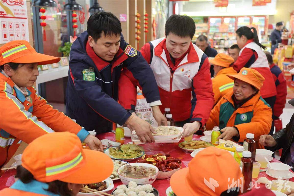 团年饭桌上,摆满了地道的湖北风味,来自潜江的小龙虾代表着“红红火火”,寓意“好运连连”的排骨藕汤、象征“阖家团圆”的全家福、祝愿“鸿运当头”的鱼头泡饭,还有珍珠圆子、沔阳三蒸、腊肉炒菜薹等,配以清润的双柚汁和青砖茶。这天来吃饭的环卫工人、司机们与加能站员工围坐在一起,欢声笑语中,一整年的疲惫渐渐消散。