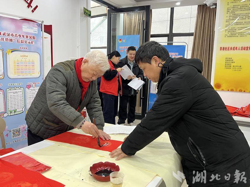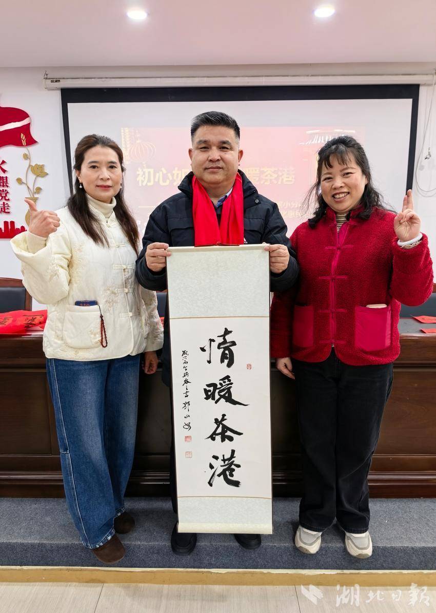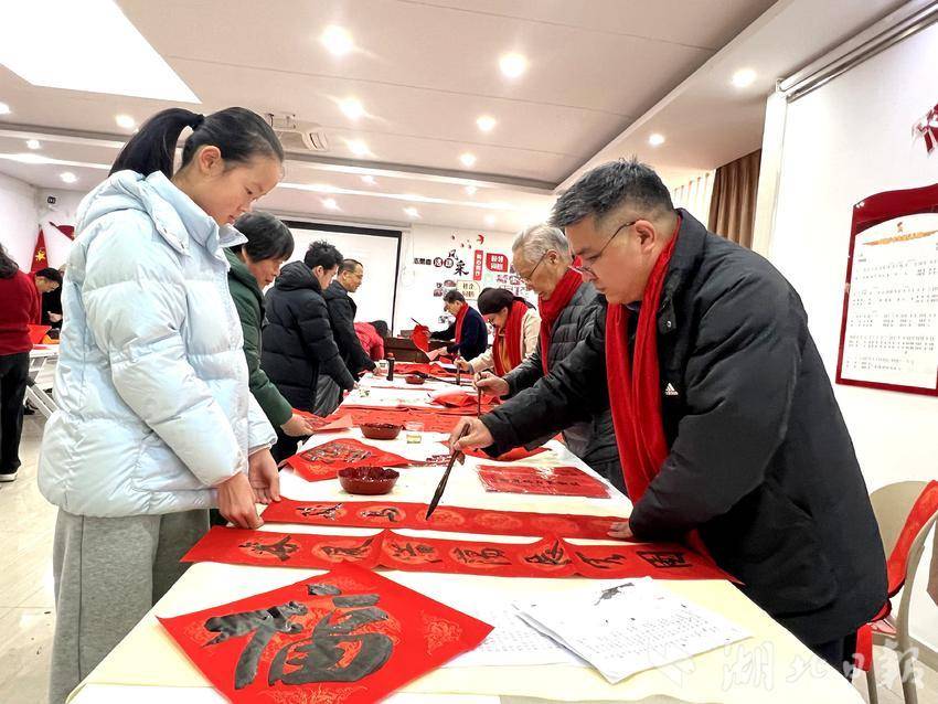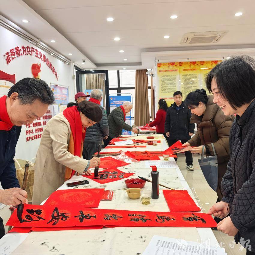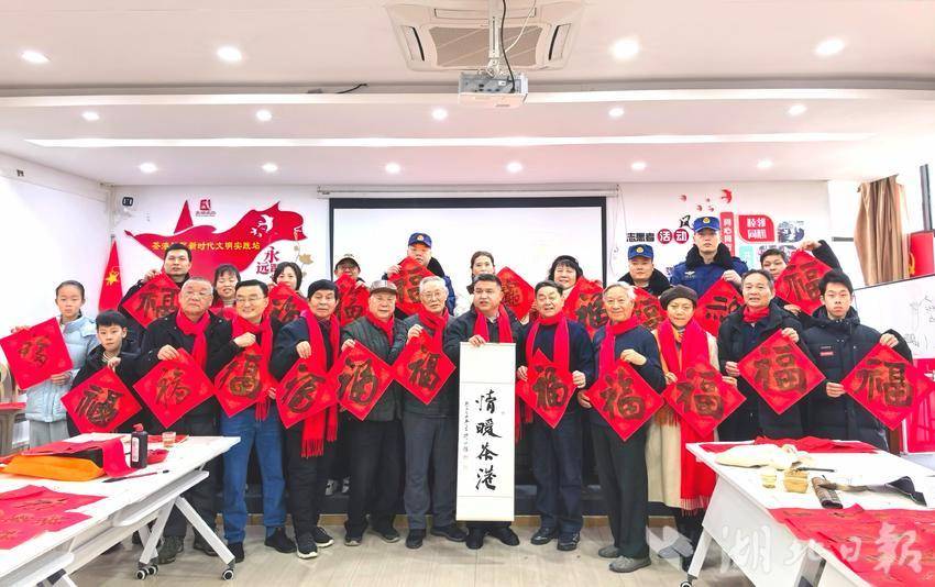 湖北日报讯(通讯员沈植)2月10日,农历腊月廿三,武昌水果湖街道茶港社区会议室里暖意融融。当日正值北方小年,由湖北省书协省直分会副会长张家厚、张炳安、毛汉斌、李寿清,副会长兼秘书长郭永安、副秘书长王敏、刘幸来、陈艳荣,省直书法家丁大忠、蒋雪岩等人组成的荆楚“红色文艺轻骑兵”小分队,满载着新春的祝福与文化的温度,走进该社区,为群众送去新春的祝福。
