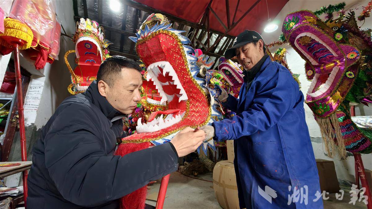 2月10日,农历腊月二十三,在武汉市黄陂区六指街道罗家岗村的一个小作坊里,昂然的龙灯、威猛的狮子头、喜庆的彩莲船,挤得满满当当,栩栩如生,满屋喜气。