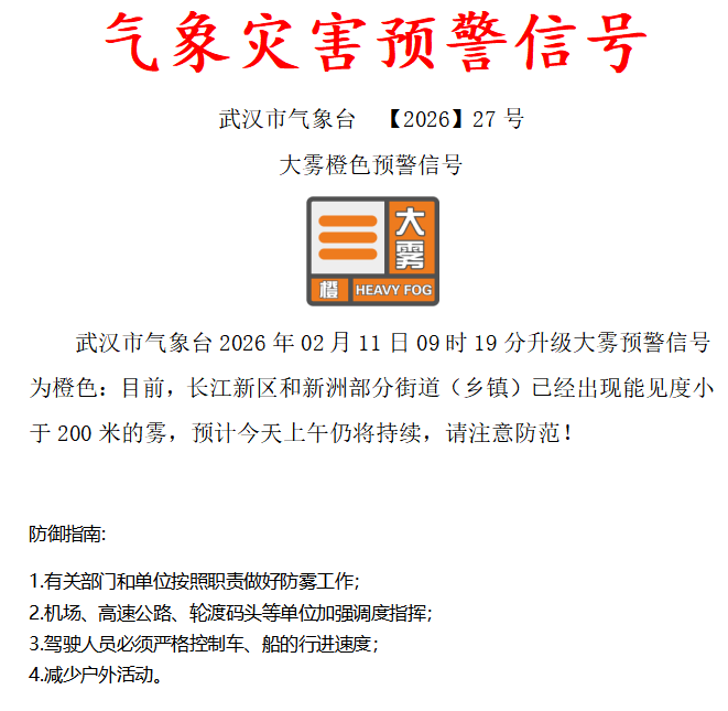 今天,武汉市气象台09时19分升级大雾预警信号为橙色。