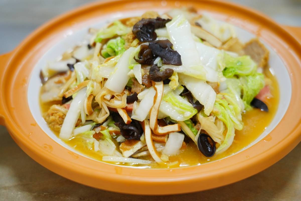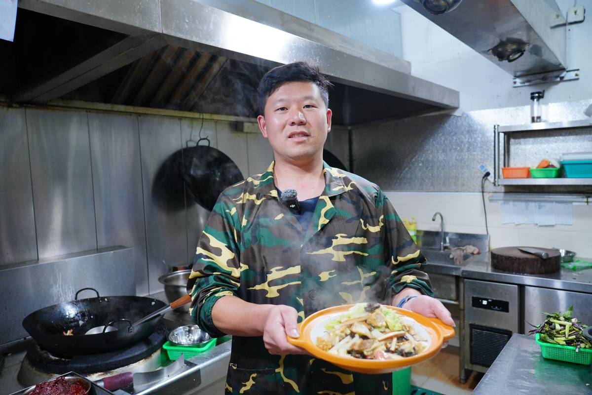 午后,竹根滩镇老街的丰顺餐馆后厨正忙。老板兼主厨张丰将大白菜、黑木耳、肉丸子、五花肉、黄花菜等食材一一码齐,朴实而丰盛。“贺菜要做得好,食材须鲜,火候要对。”他边说边做——焯水锁鲜,猪油煸肉,姜蒜爆香,再下蔬菜翻炒,一勺白醋激出香气,最后勾薄芡收汁。腾腾热气从厨房漫出,引得食客频频探头。