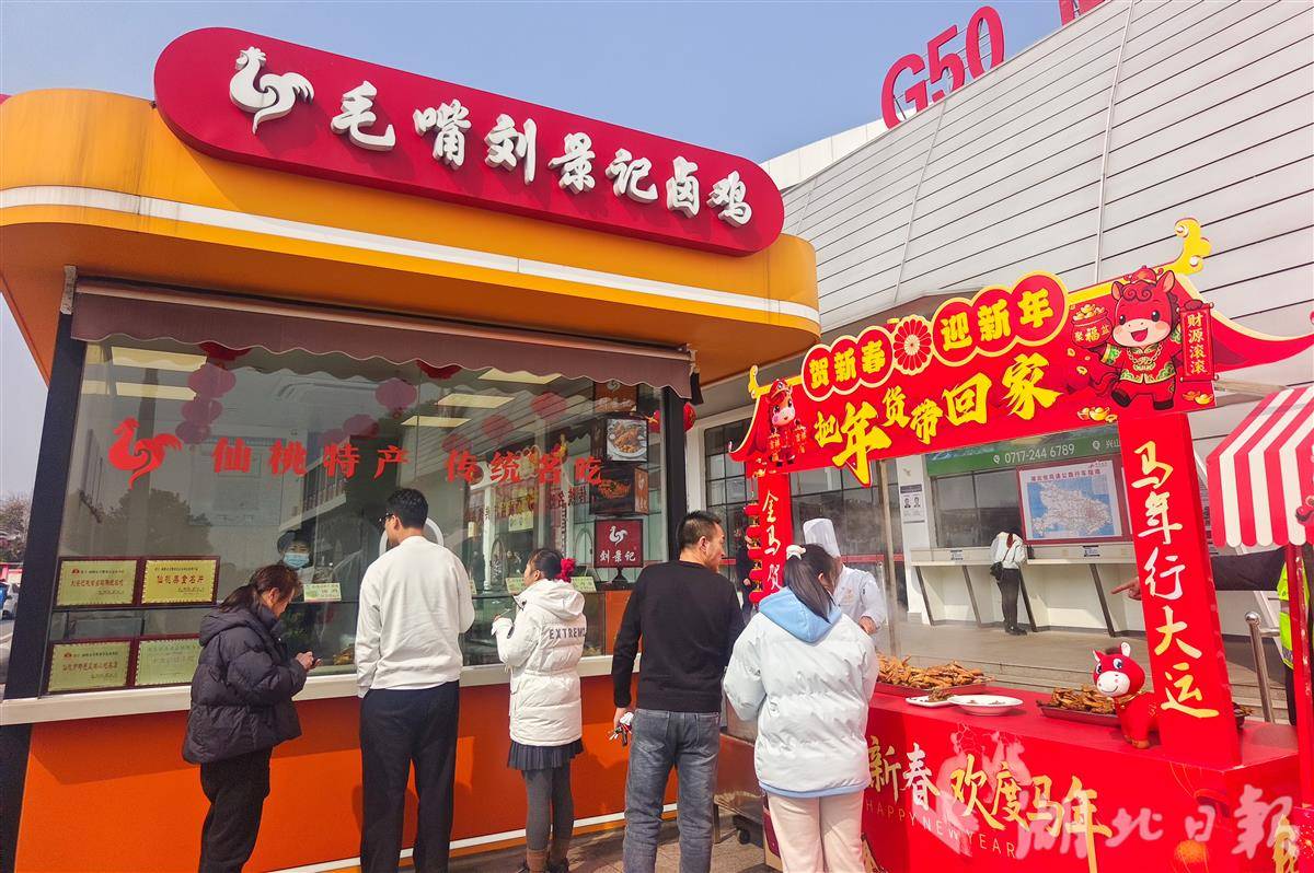 2月11日,时值南方农历小年,沪渝高速仙桃服务区挂满年味灯笼,广场人流穿梭,400多车位的停车区已停满小车,综合大楼门口的毛嘴刘景记卤鸡店让众多返乡客停下脚步。
