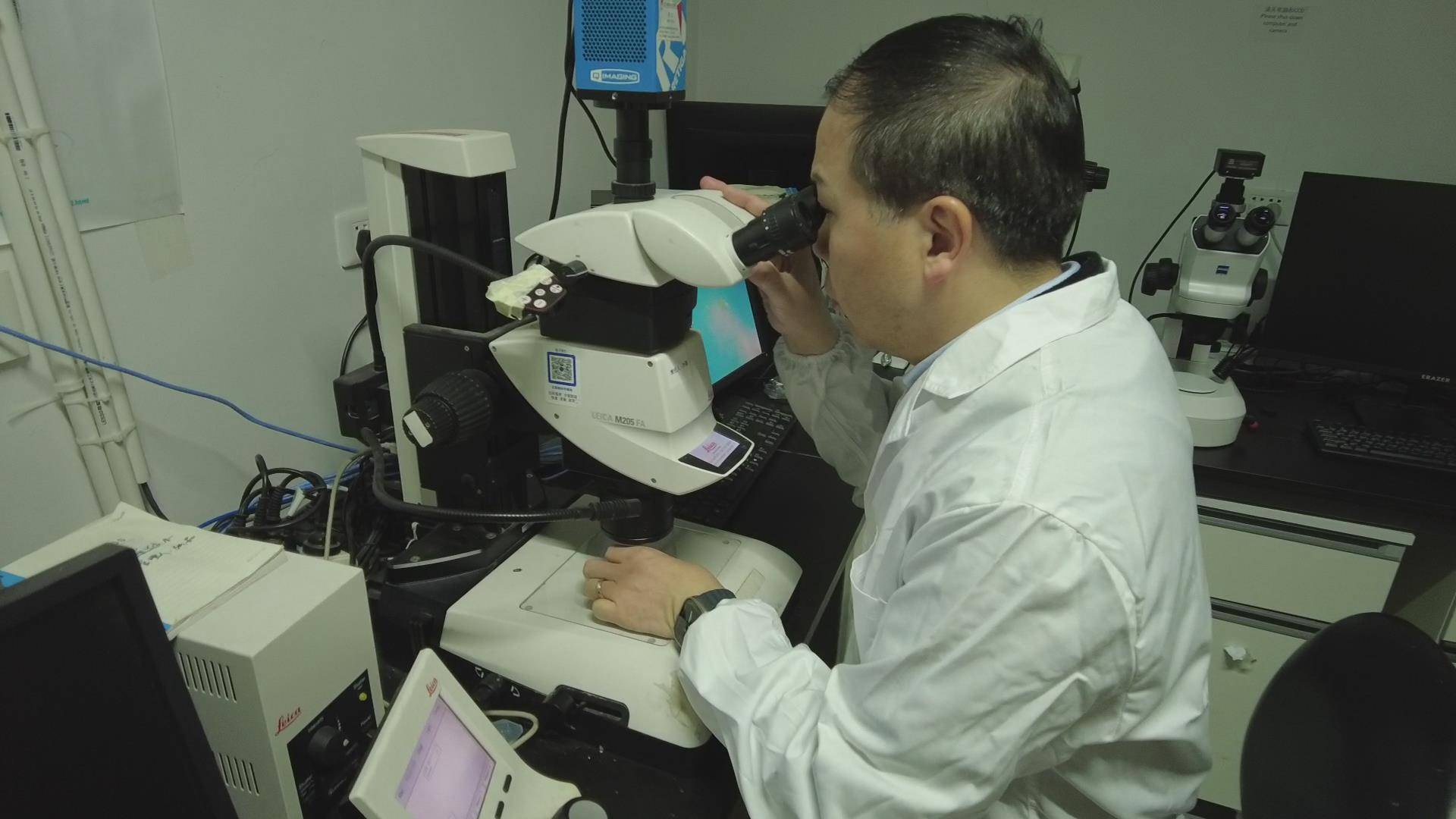 孙永华在实验室进行显微镜下鱼类胚胎观察。 (记者 李玉麟 摄)