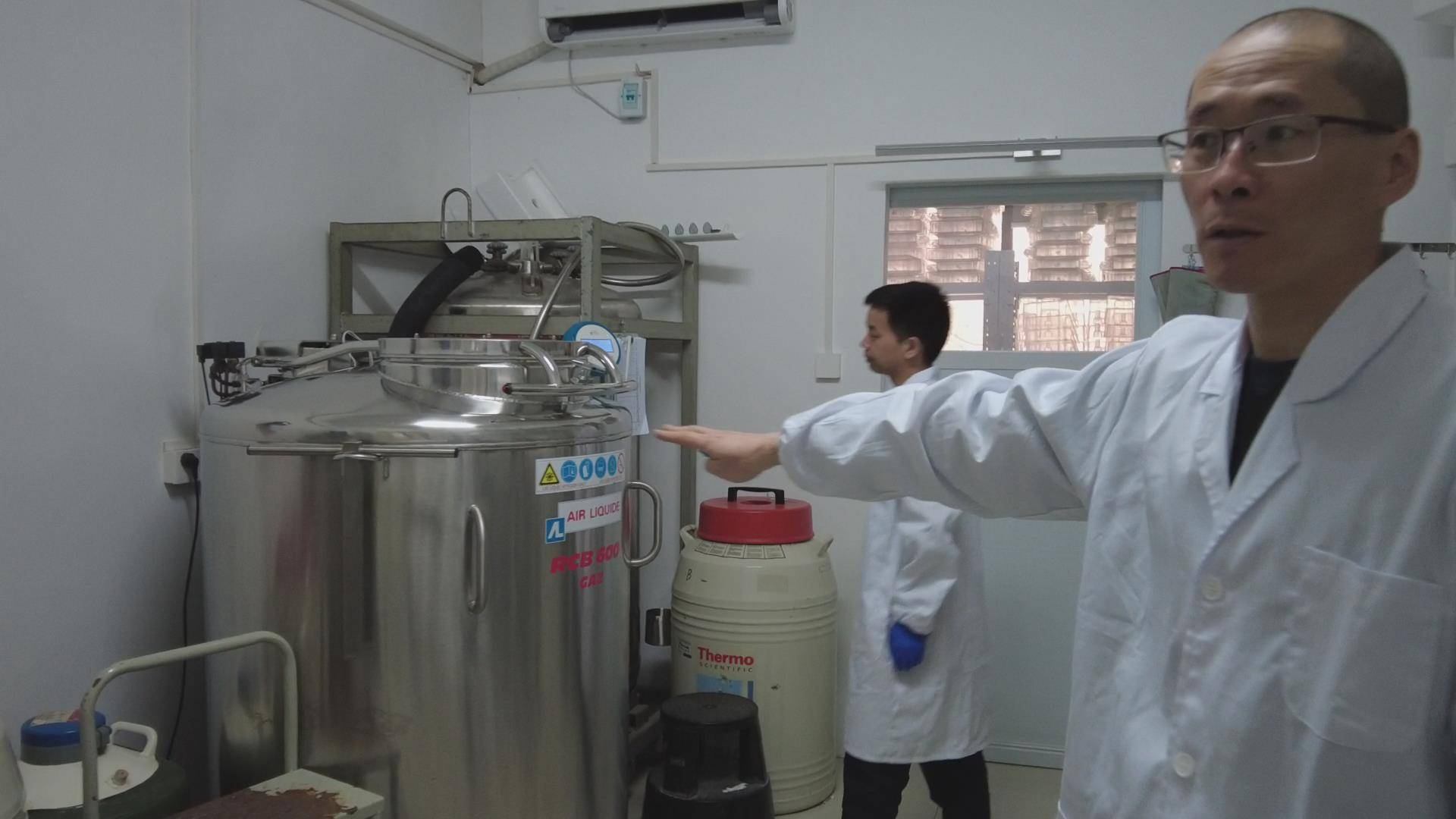 李阔宇高级实验师(右一)给记者介绍,90%的鱼类品系是以冷冻精子的方式储存在液氮冷冻罐中的。每日巡查都要严格执行巡查和记录制度。 (记者 李玉麟 摄)