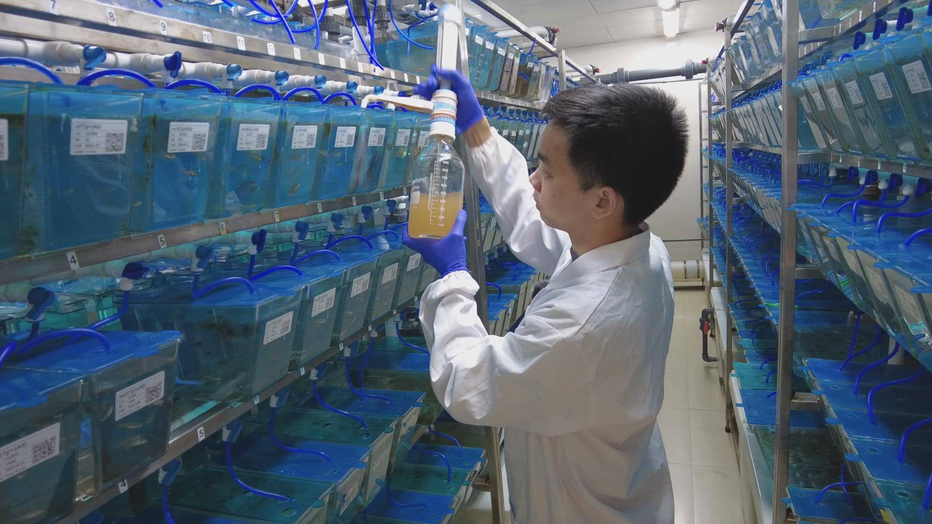 科研助理阮稳正在中心的鱼房里给斑马鱼等鱼类喂食活饵。 (记者 李玉麟 摄)