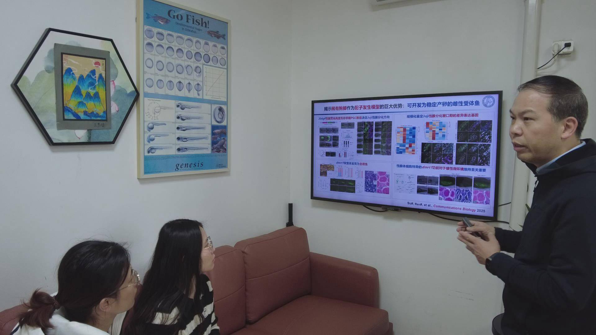 刚给研究生上完课的孙永华研究员,来不及歇脚,便快步走进实验室,拧开超高精度显微镜,俯身观测鱼类胚胎发育样本。“学生们陆续回家过年,但科研不能停。”他说,2025年团队在鱼类借腹生殖育种领域接连突破,不仅揭开了鱼类生殖细胞命运调控的新机制,更用斑马鱼“借腹生殖”技术,在6个月内培育出全雌草鱼,大幅缩短原本需要十多年的育种周期。“成果将在国际期刊刊发,你看,这是杂志主编邀请我们设计的封面,很有艺术性吧!”孙永华笑着说,“除了这些科研突破,2025年我们还完成了国家重点研发计划‘发育编程及其代谢调节’重点专项项目的结题工作。该项目持续五年,联合了全国19个单位的优势实验室,在国家自然科学基金委员会的综合绩效评价中获评‘优秀’,这是十分难得的成绩。”孙永华补充。