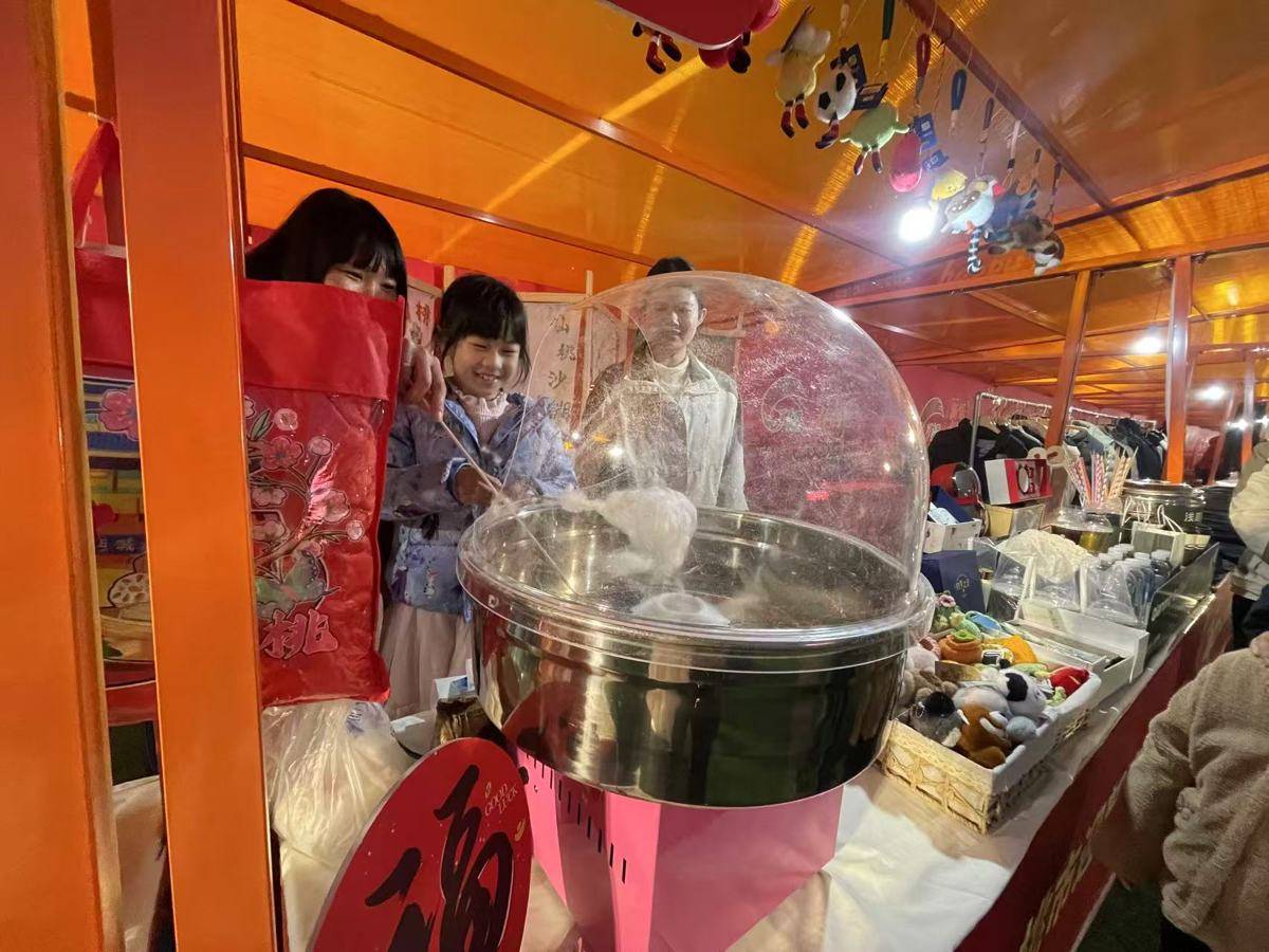 现场还设置了写春联、非遗文创、图书展销等区域。在棉花糖手作区,小朋友排起长队,争相体验这份“指尖上的年味”。