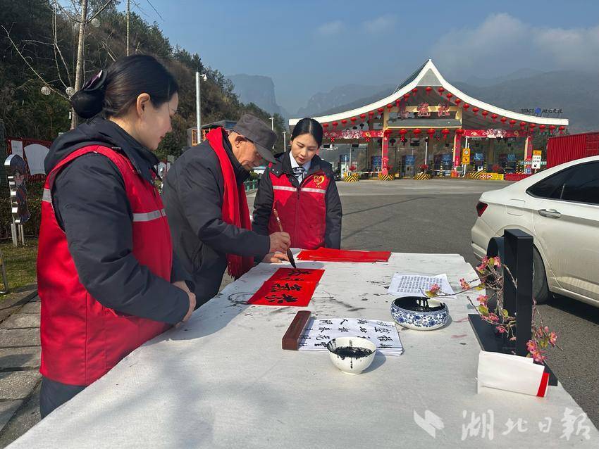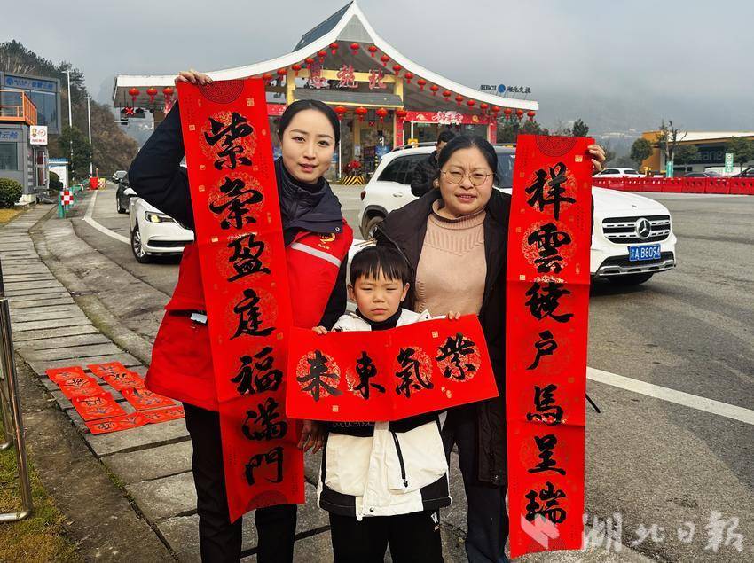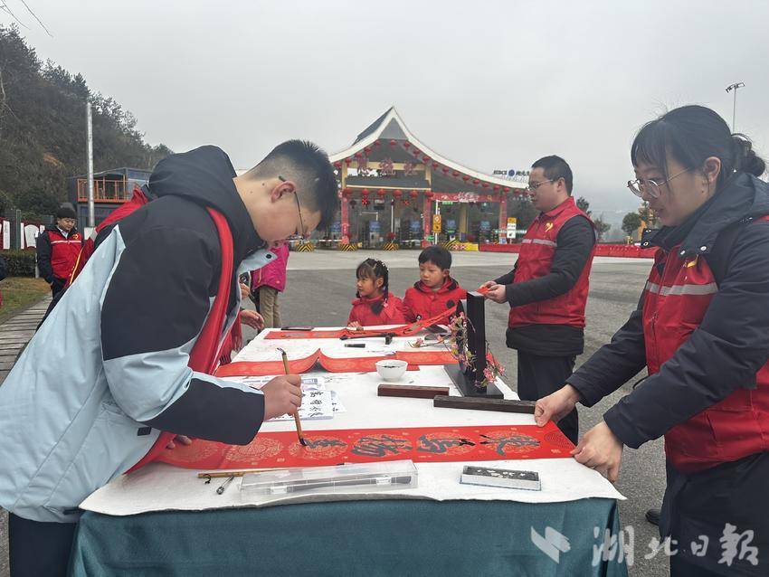 湖北日报讯(通讯员谭艳华、蒋娜)巧手写春联,送福暖归途。农历腊月廿四是南方的小年,鄂西运营公司恩施北收费站以“暖冬行动”为契机开展了“写春联、送祝福、暖归途”主题活动,书法爱好者与志愿者挥毫泼墨,将“马年大吉,平安顺遂”等美好祝福凝于笔尖,用笔墨传递祝福,用服务温暖归途。