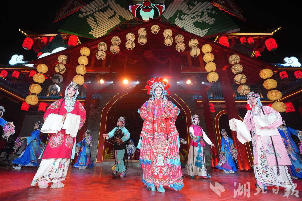 一年四季,每当暮色四合,竹溪武陵不夜城的红灯笼就会次第亮起,戏服华美的演员踏着鼓点登台,国家级非遗“山二黄”的唱腔穿透街巷。台下,游客或端着竹溪麻糖驻足聆听,或身着汉服在戏曲主题灯牌前留影,闲置近十年的商业楼盘,被烟火气与文化味填得满满当当。