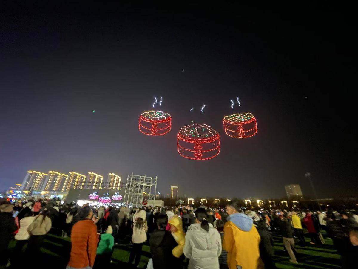 无人机编队组成“沔阳三蒸”图案。湖北日报全媒记者 杨康 摄
