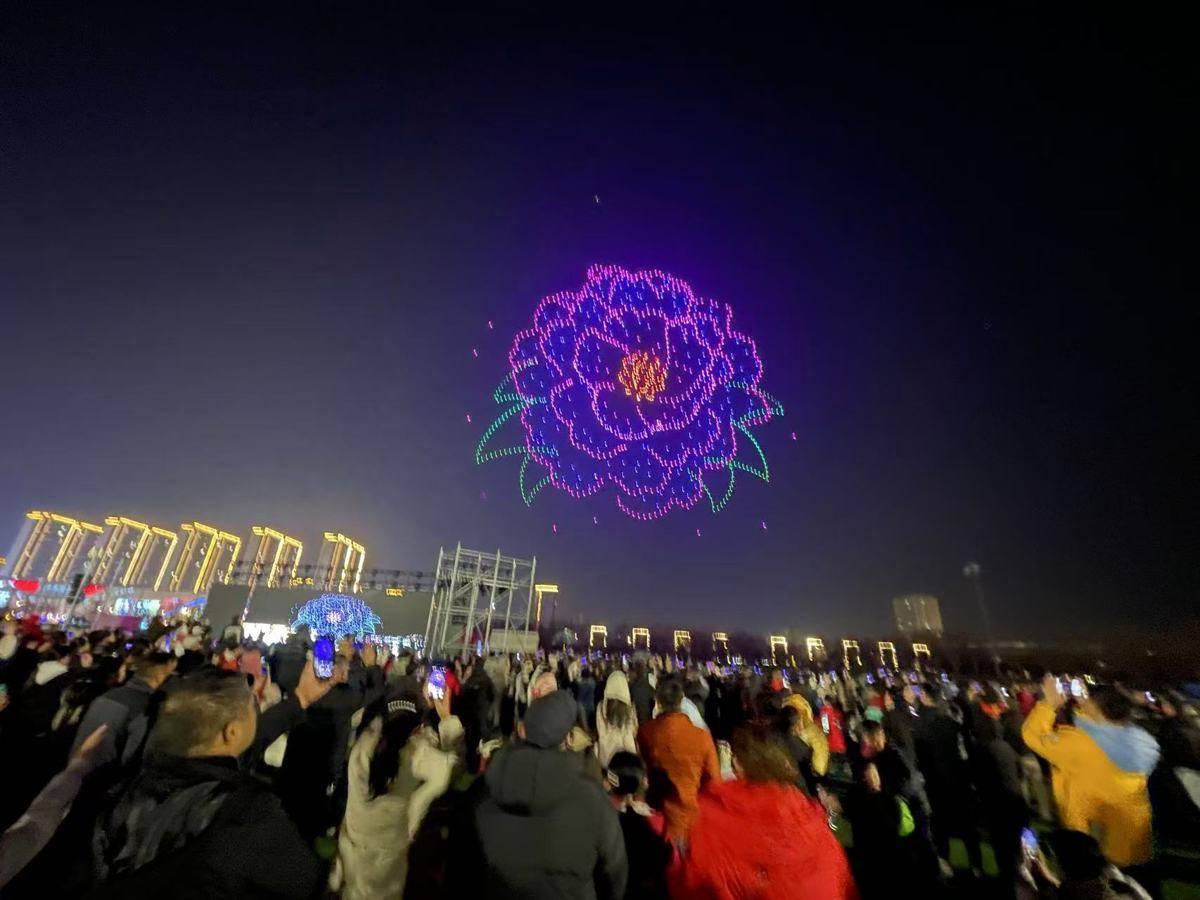无人机编队组成“花开富贵”图案。湖北日报全媒记者 杨康 摄