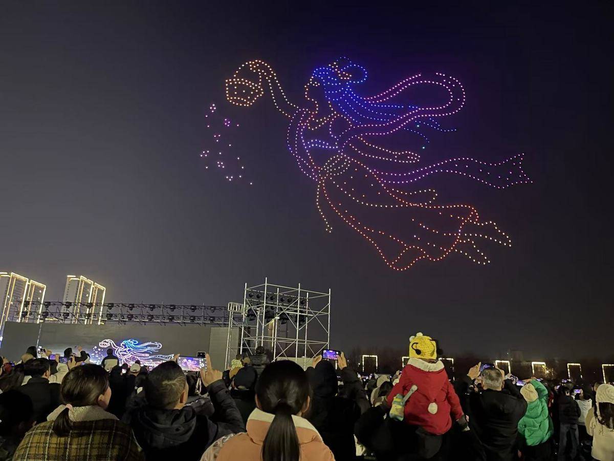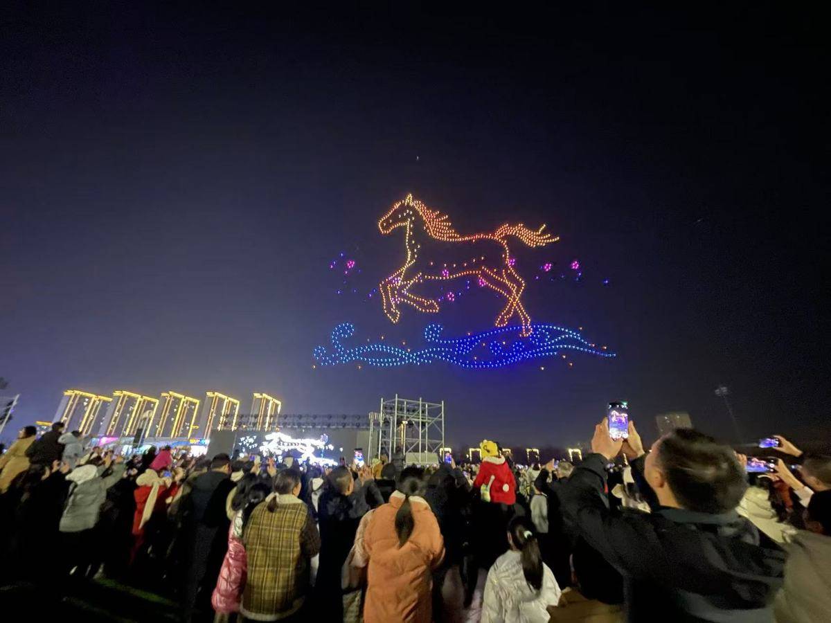 一匹金色骏马踏浪而来,蹄下生花,鬃毛飞扬,拉开无人机秀的序章。