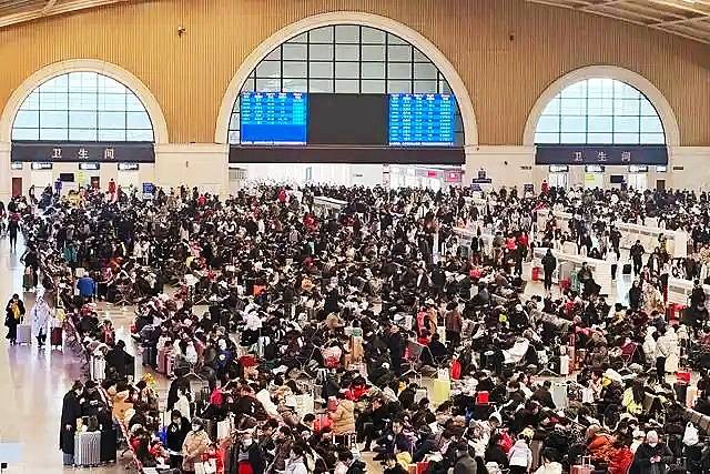 汉口火车站二楼候车大厅内座无虚席,秩序井然
