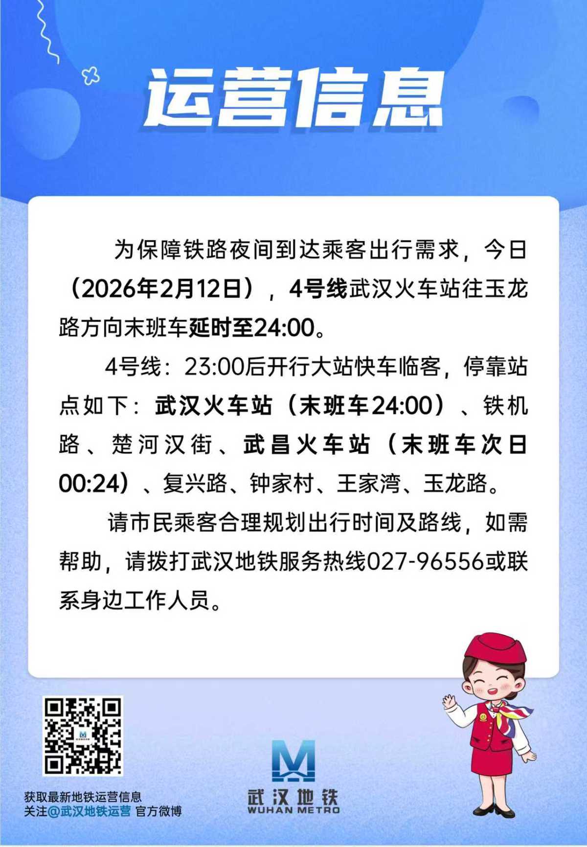 湖北日报讯(记者黄洁如、通讯员李丹、产启斗)为保障铁路夜间到达乘客出行需求,今日(2月12日),4号线武汉火车站往玉龙路方向末班车延时至24:00。
