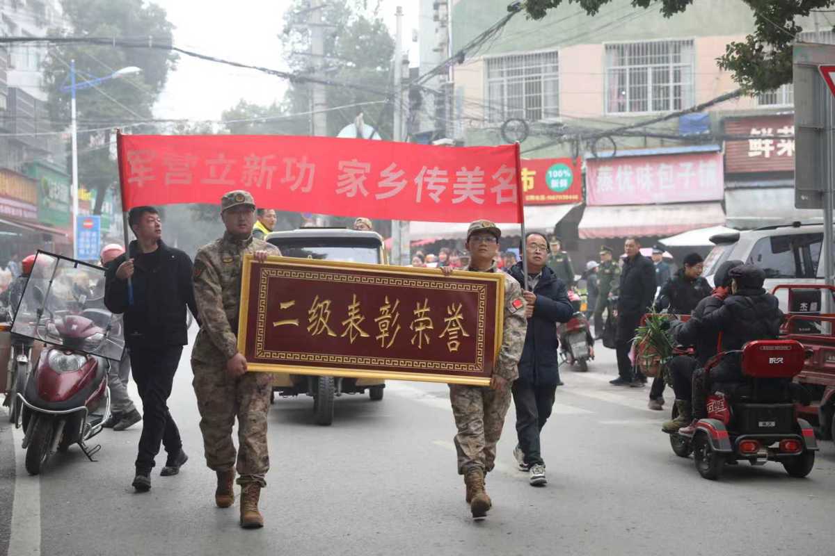 清晨,浠水县清泉镇河东街村锣鼓喧天、气氛热烈。在军地领导共同见证下,胡志刚身披绶带、胸戴红花,在腰鼓队的欢庆声中,与军地领导一道步行返回家中。军地领导向其家庭颁授“二等功臣之家”牌匾,并送上慰问金。随后,慰问组与胡志刚及其家人进行了亲切座谈,详细了解他在部队的训练生活情况,对其取得的优异成绩表示祝贺,感谢家人一直以来的理解与支持。胡志刚激动地表示,荣誉归功于部队培养,今后将继续努力,为国防事业再立新功。