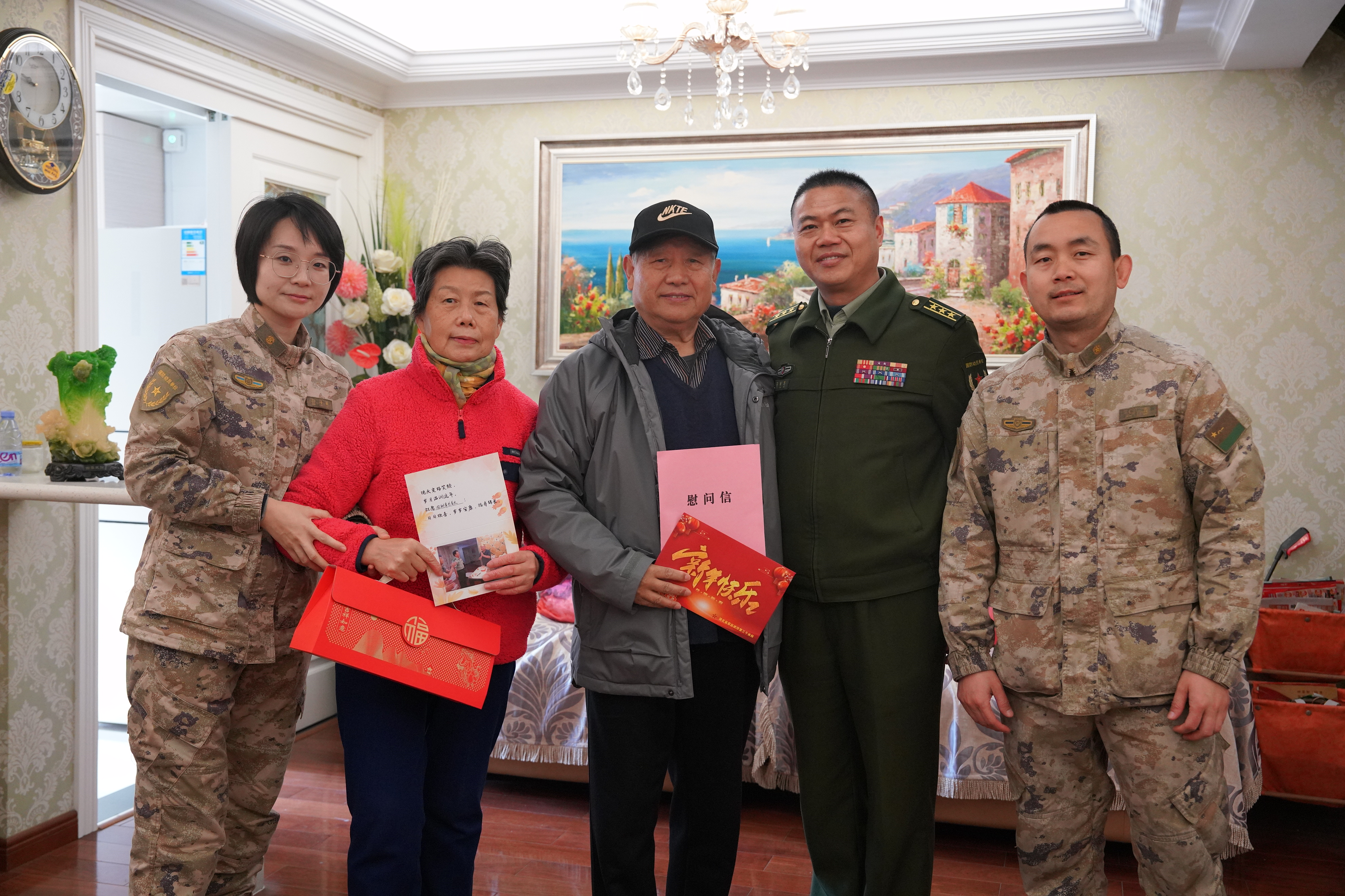 活动中,干休所负责人带队逐户登门走访,严格落实厉行节约相关要求,坚持用心不重价、实惠更暖心原则,以一封慰问信、一笔慰问金、一副新春联、一个防护包、一句温馨语、一张纪念照的“六个一”暖心举措,为全体老干部、老阿姨送上诚挚的新春问候与美好祝福。工作人员亲手将红彤彤的春联贴上门楣,把慰问信、慰问金和防护包送到老同志手中,一句句贴心问候,一声声美好祝愿,让每一户受慰问家庭都洋溢着喜庆祥和的节日氛围。