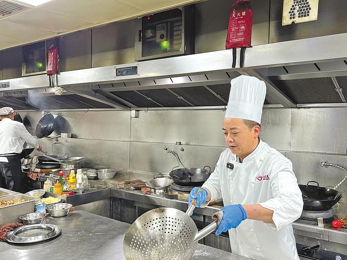 夜幕降临,饭店大厅里觥筹交错。左许惠和十几位同事在各自岗位上忙碌,锅铲碰撞声、油烟机轰鸣声、传菜员的吆喝声交织在一起,构成独特的年味“交响曲”。